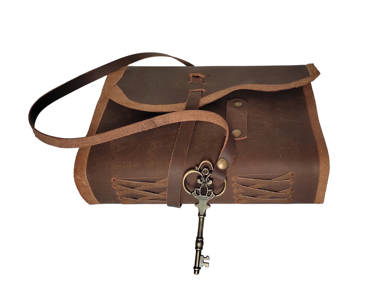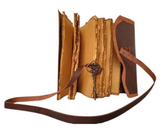 The journal features a charming antique key and a long leather strap, ensuring your notes, sketches, and secrets are securely locked away.