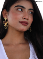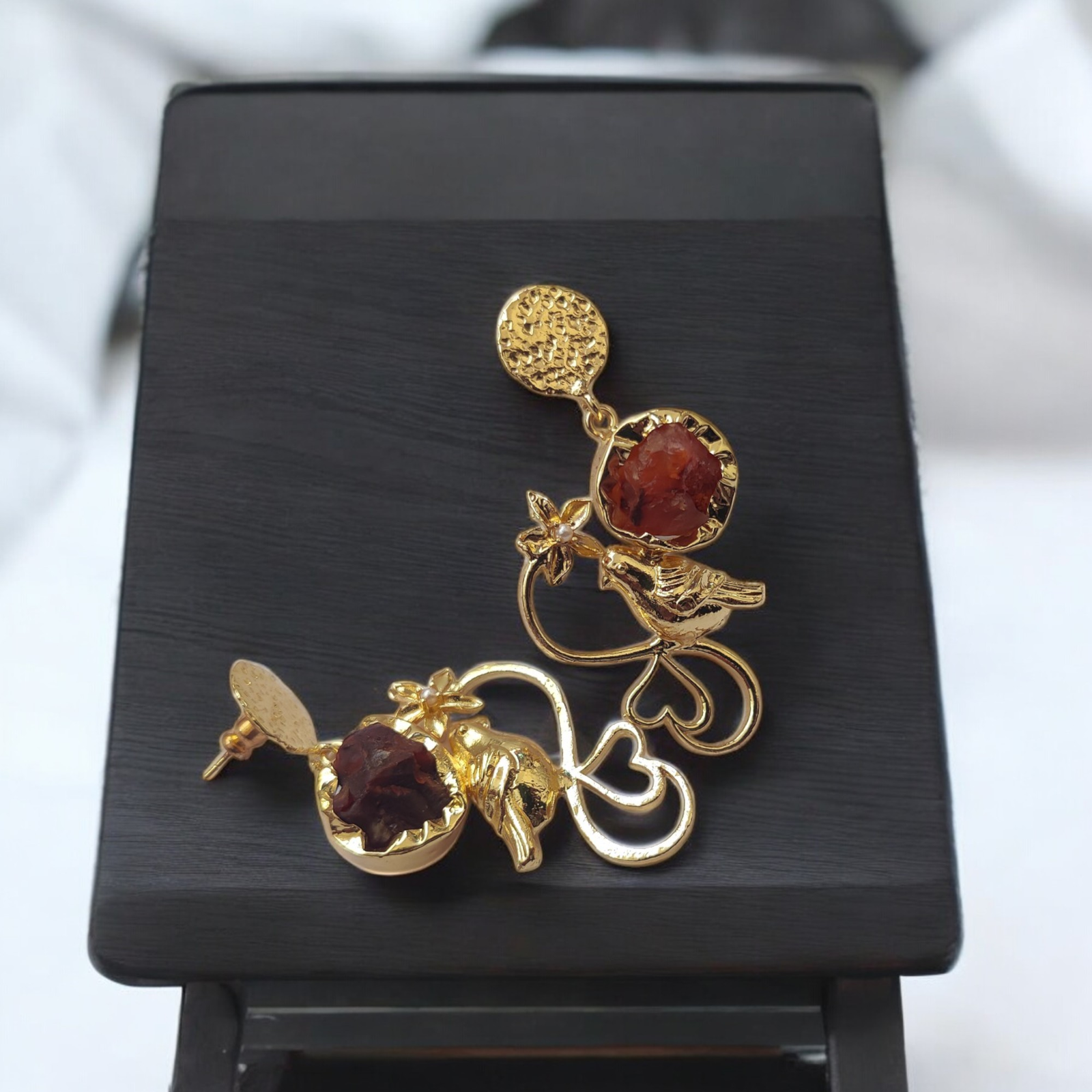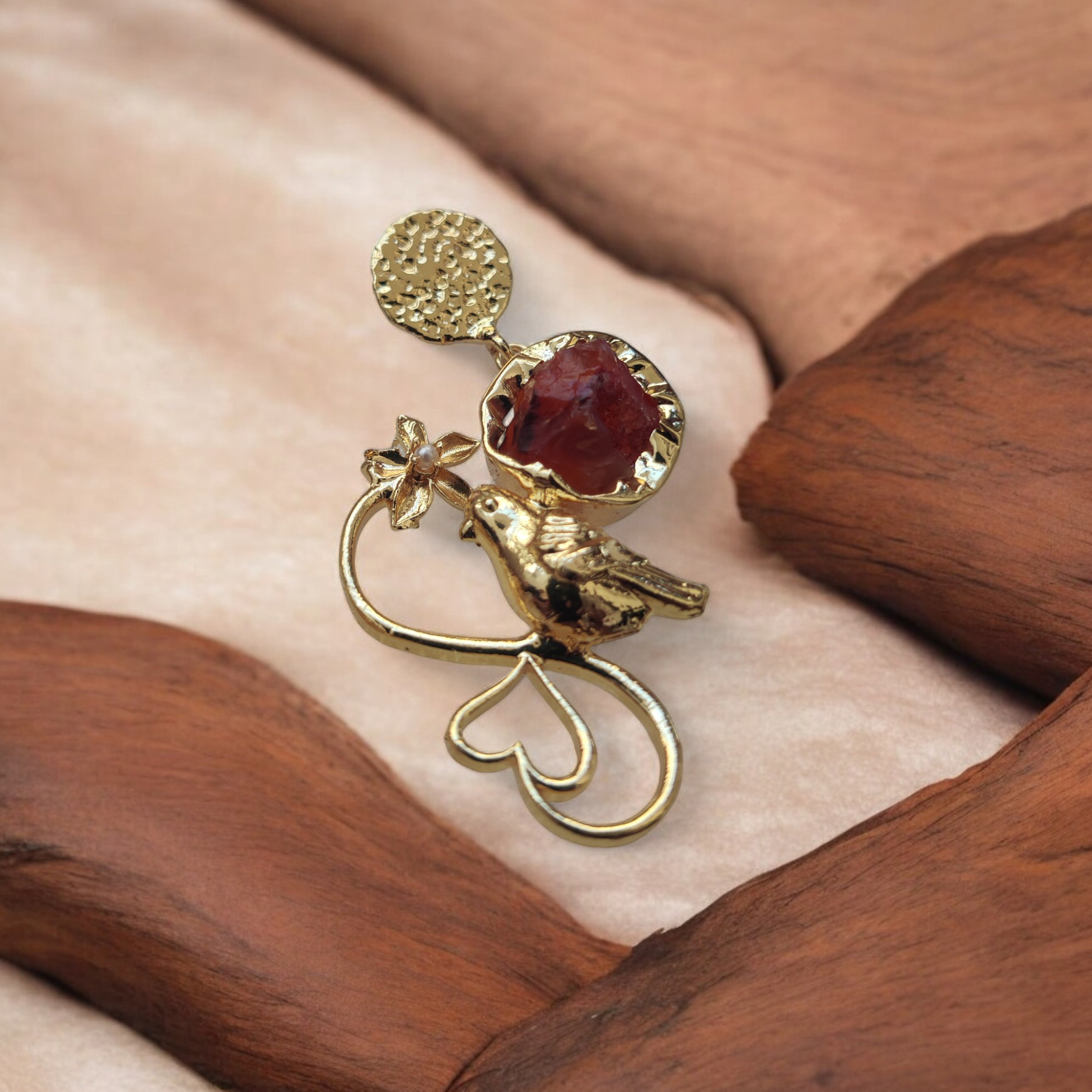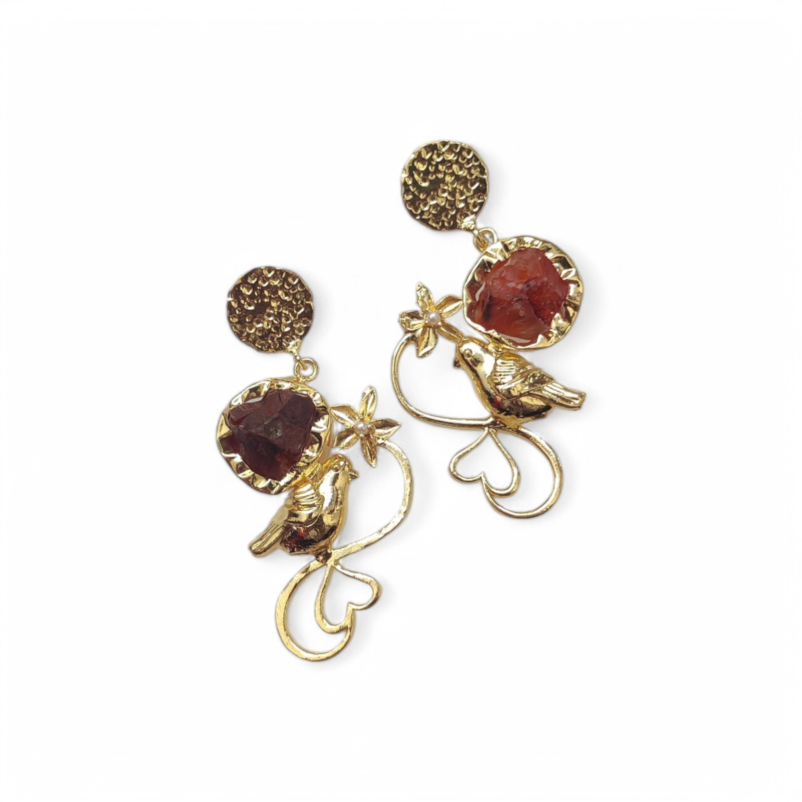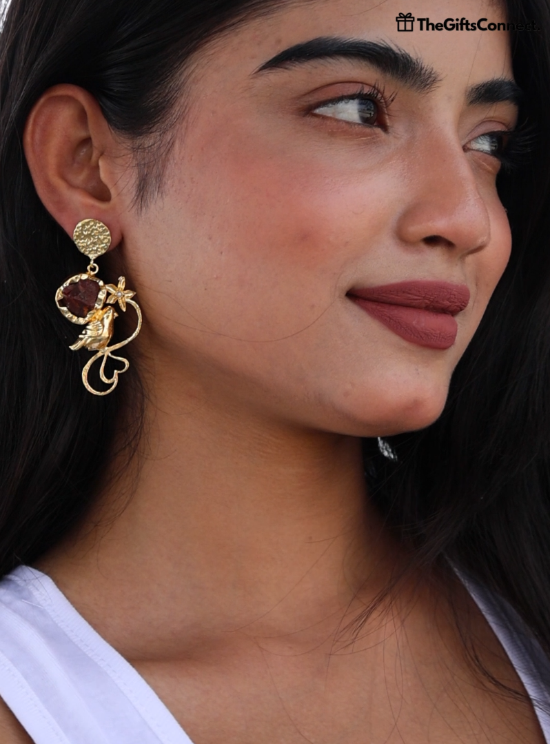 Each earring features a beautifully etched garden-inspired brass design, where delicate birds perch gracefully among blooming florals. Nestled within this golden garden is a radiant red Carnelian stone, glowing like the heart of a sunset. The contrast between the soft bird motifs and the bold gemstone creates a story of serenity and strength—gentle yet empowering.