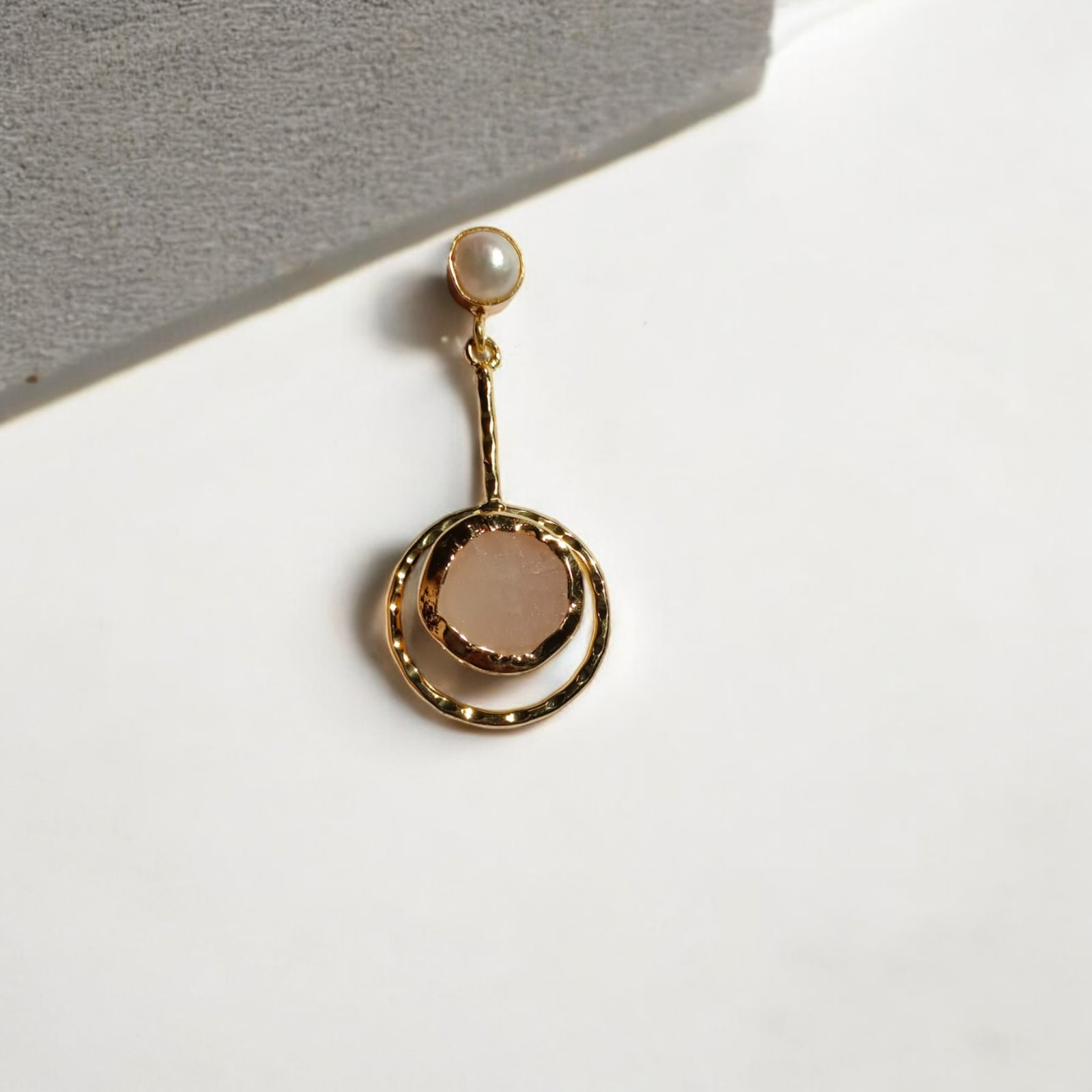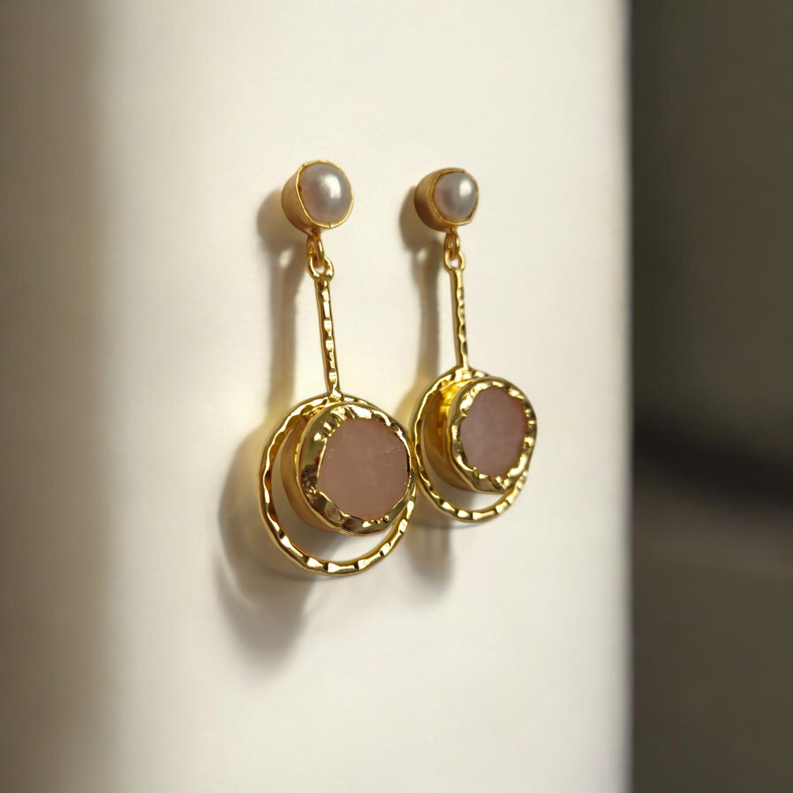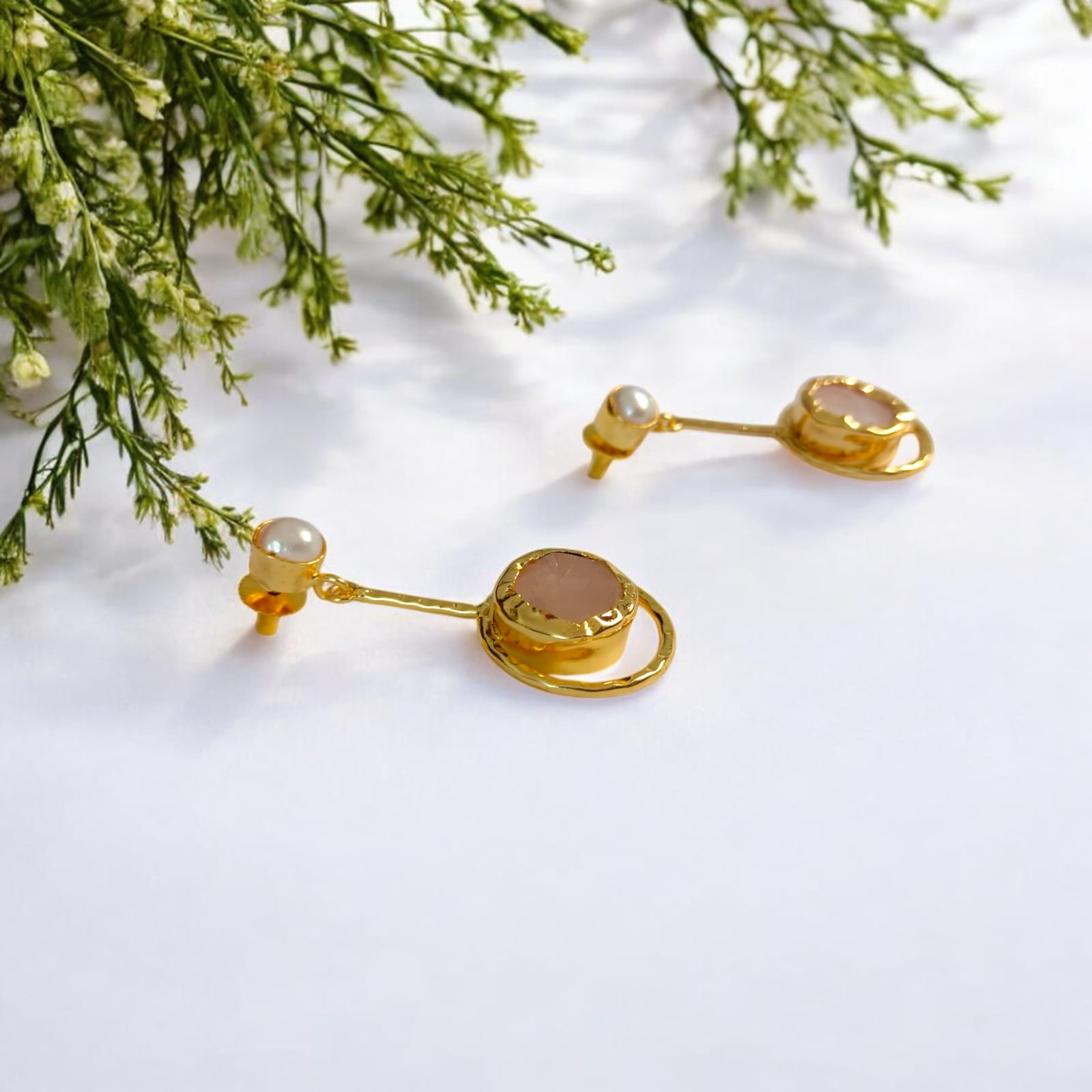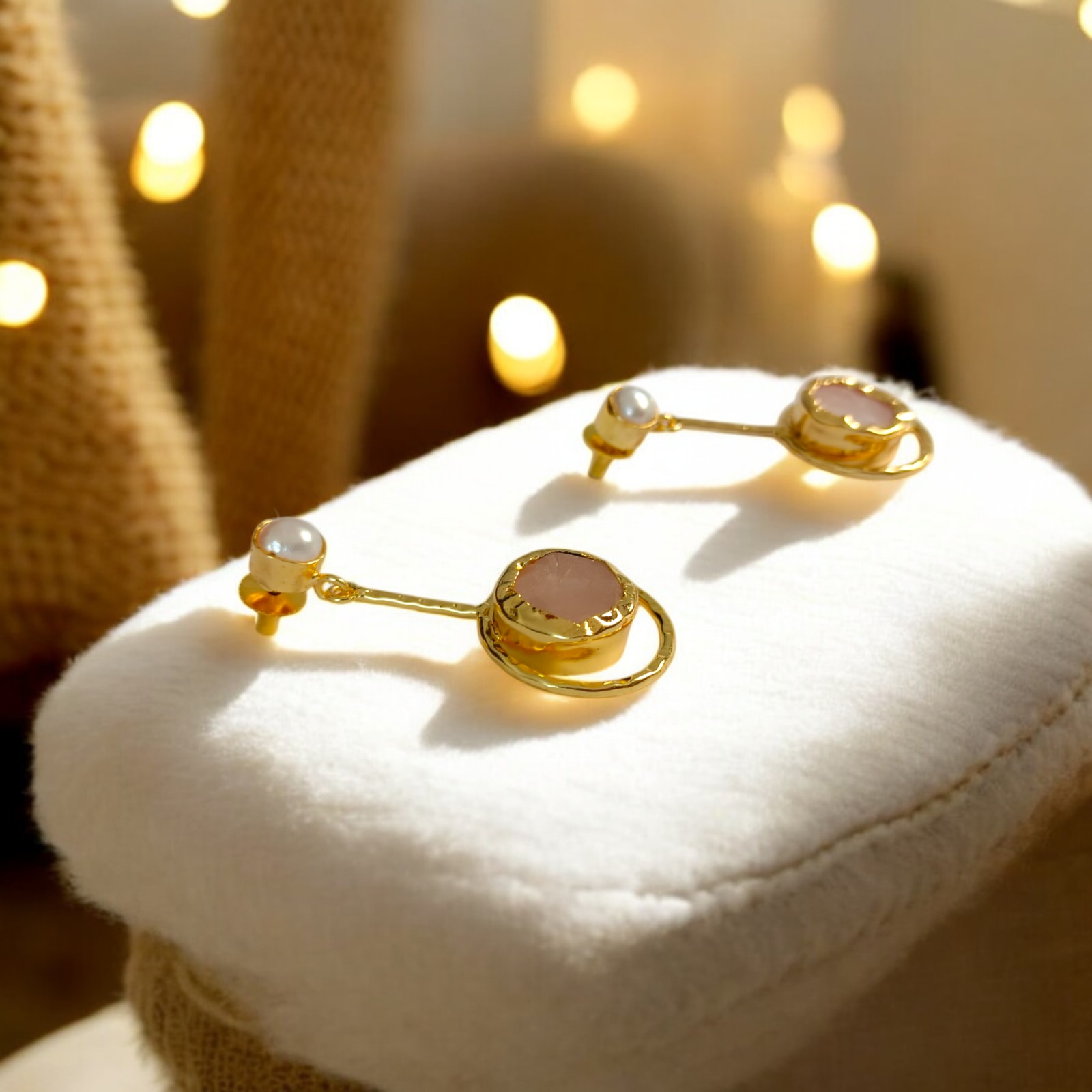Each pair is thoughtfully made by hand, featuring pale pink rose quartz teardrops and luminous pearls that feel like little love notes from nature. The brass settings add just the right touch of golden glow—warm, grounding, and effortlessly stylish.