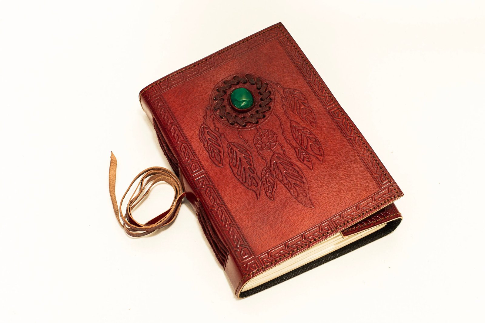 Embrace the magic of dreams and creativity with this exquisite Celtic Dream Catcher Leather Journal. Featuring a beautifully embossed dream catcher design and a protective green onyx stone, this handmade journal is a perfect blend of spirituality, artistry, and functionality. Whether you’re capturing your thoughts, sketching your dreams, or planning your next adventure, this journal is a timeless companion for dreamers and creators alike.