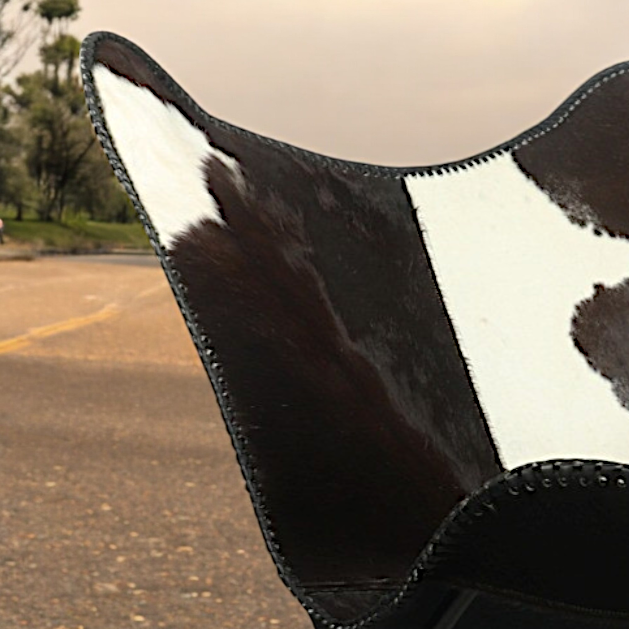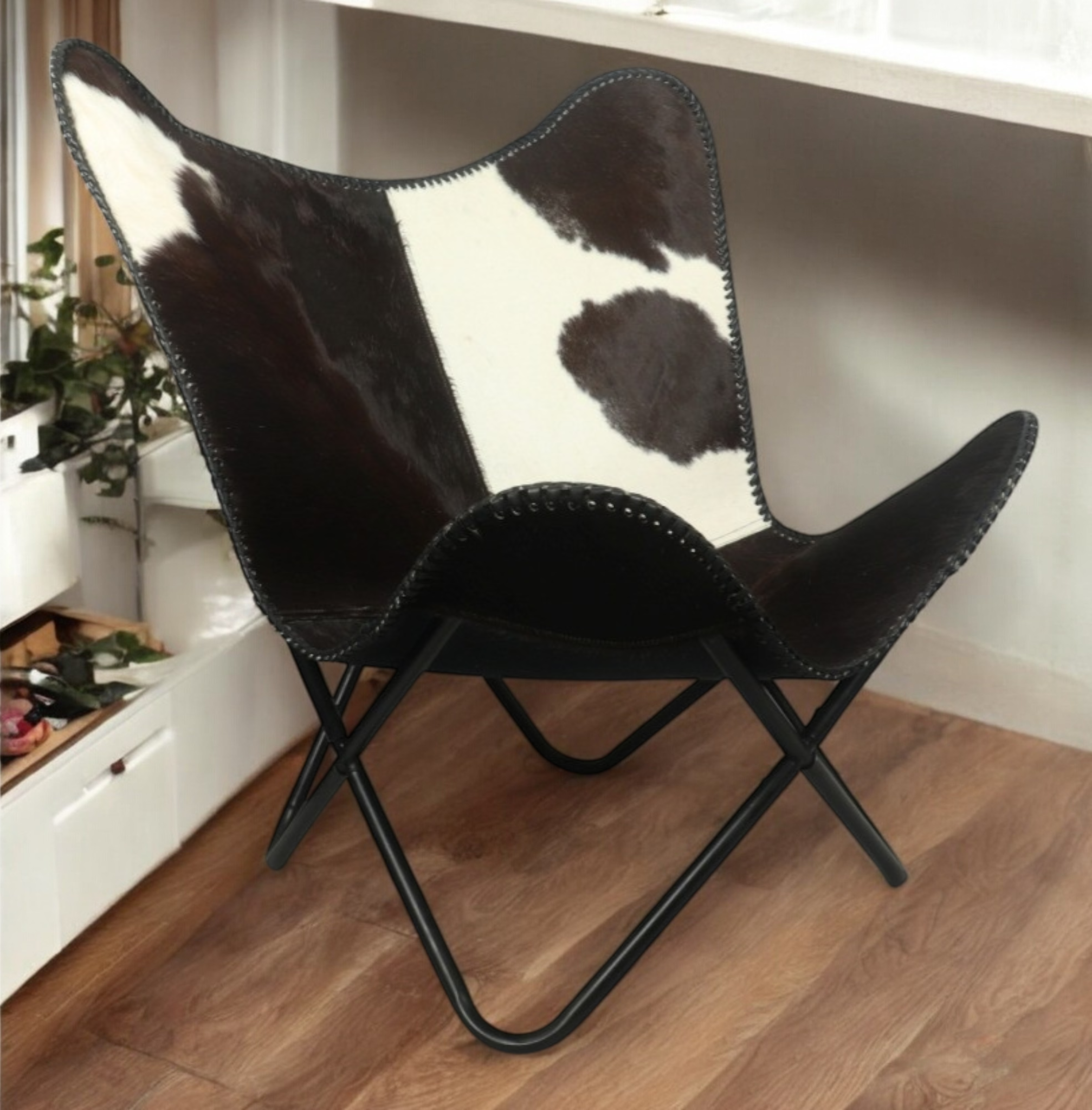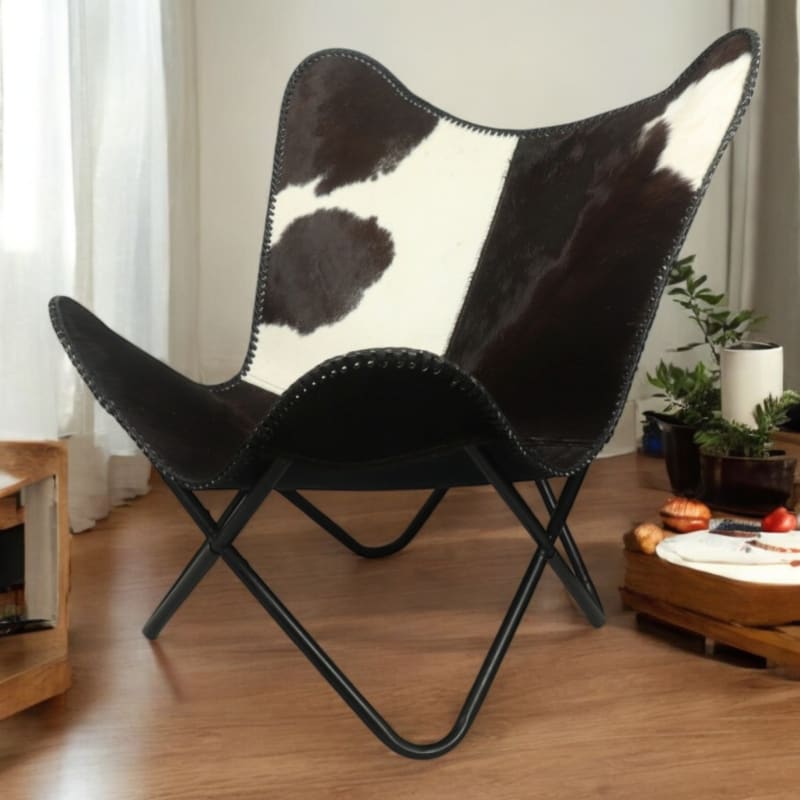 Crafted from genuine hairon leather, each chair boasts a unique pattern, making no two pieces exactly alike. The natural hide offers a soft, supple feel while adding a sophisticated touch to your decor. Whether placed in a cozy reading nook, a modern loft, or a stylish lounge area, this chair exudes effortless charm.Its iconic butterfly silhouette isn’t just about aesthetics—it’s designed for supreme comfort. The deep, slouchy seat provides just the right amount of support while inviting you to sink in and relax. Paired with a sturdy, powder-coated iron frame, it ensures durability while maintaining a lightweight and airy structure.