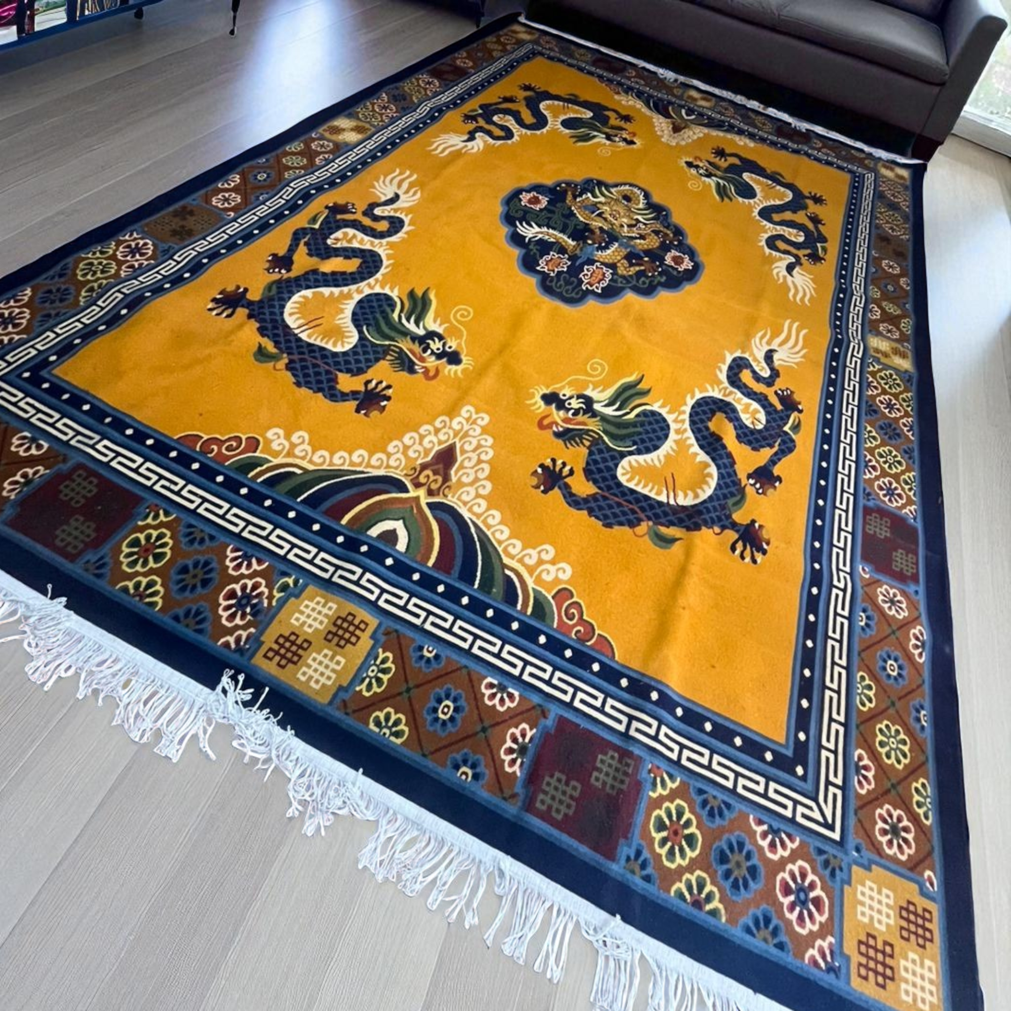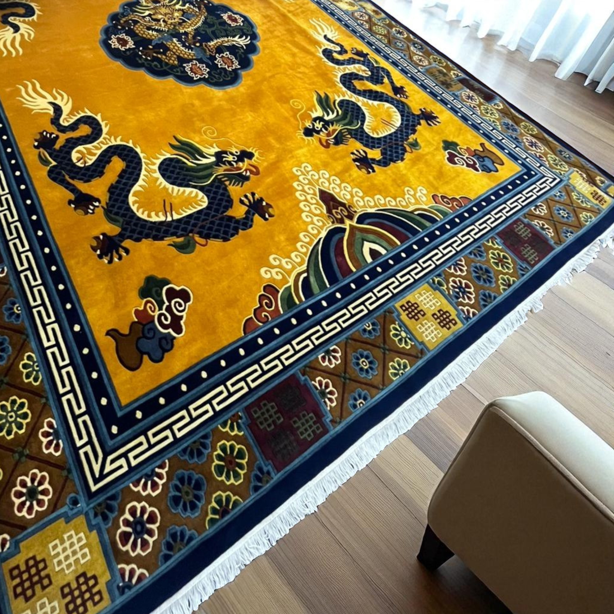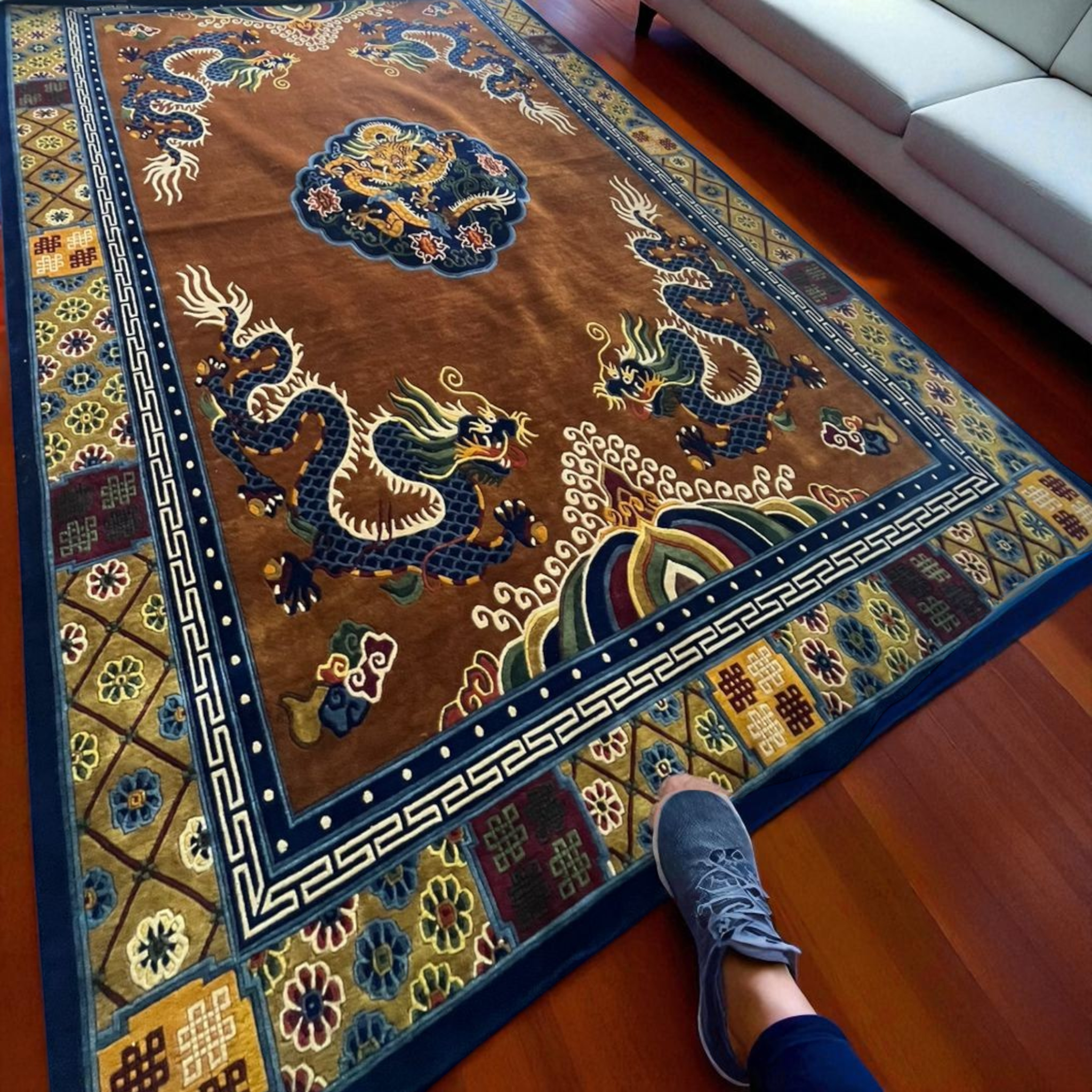 Every rug is a true labor of love, hand-knotted by skilled artisans using 100% premium hand-spun wool, ensuring a soft, warm, and incredibly durable texture underfoot. The intricate dragon medallion, framed by ornate traditional borders in rich golden yellows and deep browns, makes this rug a striking statement piece for any space.