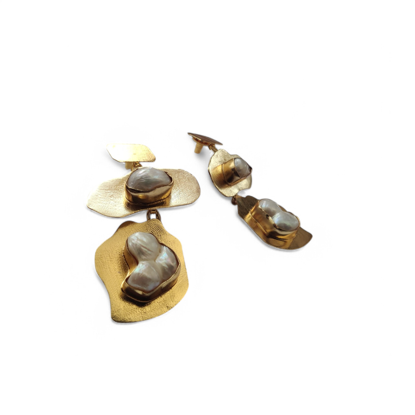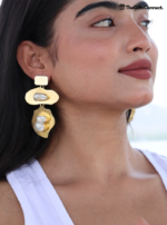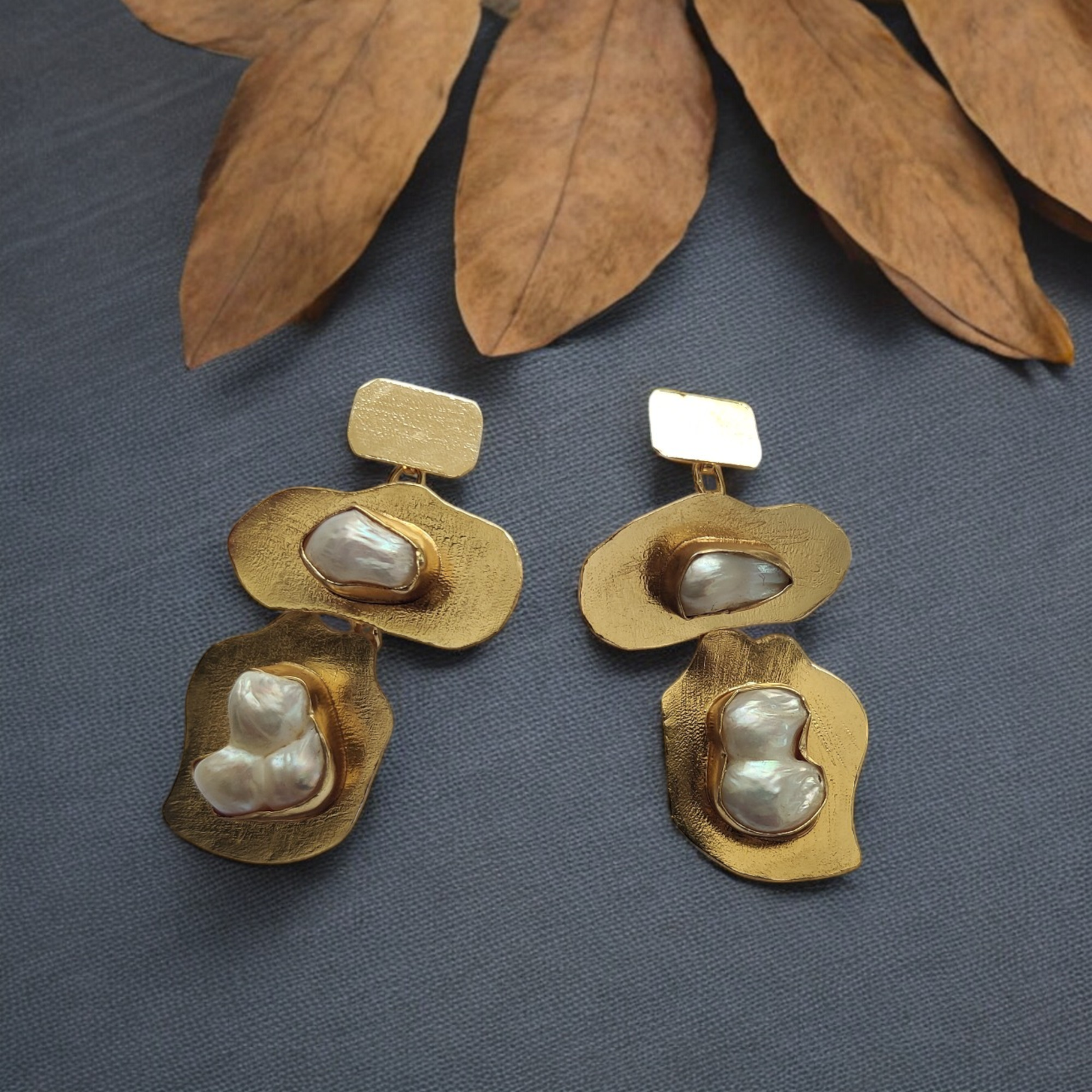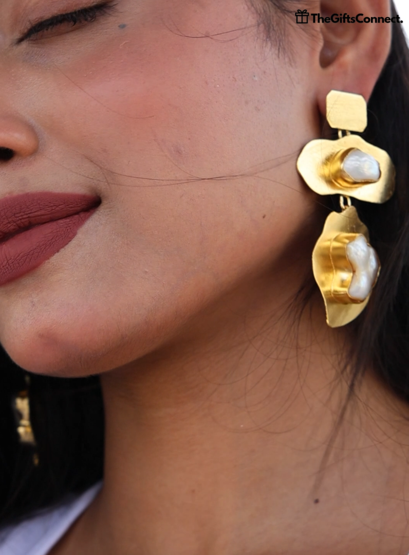 The Golden Bloom earrings are a tribute to nature’s quiet grace — handcrafted with textured brass leaves and glowing Fresh water baroque pearls, each piece feels like a little story whispered by the wind. The irregular beauty of the pearls adds soul and softness, while the golden leaf design brings a modern botanical charm.