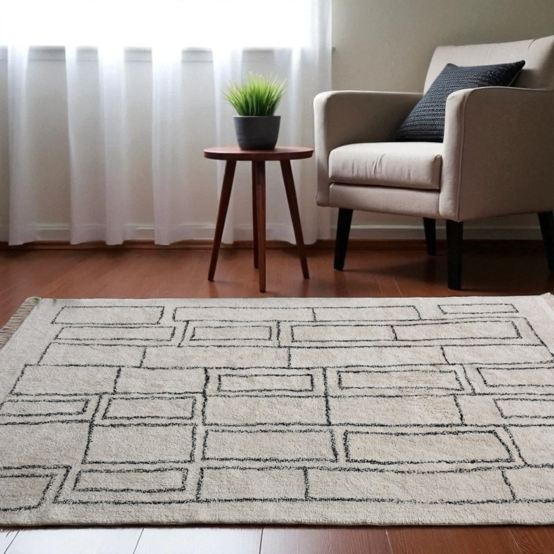 Elevate your home with the refined charm of our Hand Knotted Geometric Cotton Rug — a perfect blend of modern design and traditional craftsmanship. Meticulously handcrafted from high-quality cotton, this rug features an eye-catching pattern of irregular rectangular motifs, creating a clean and contemporary visual rhythm that adds artistic flair to any space.