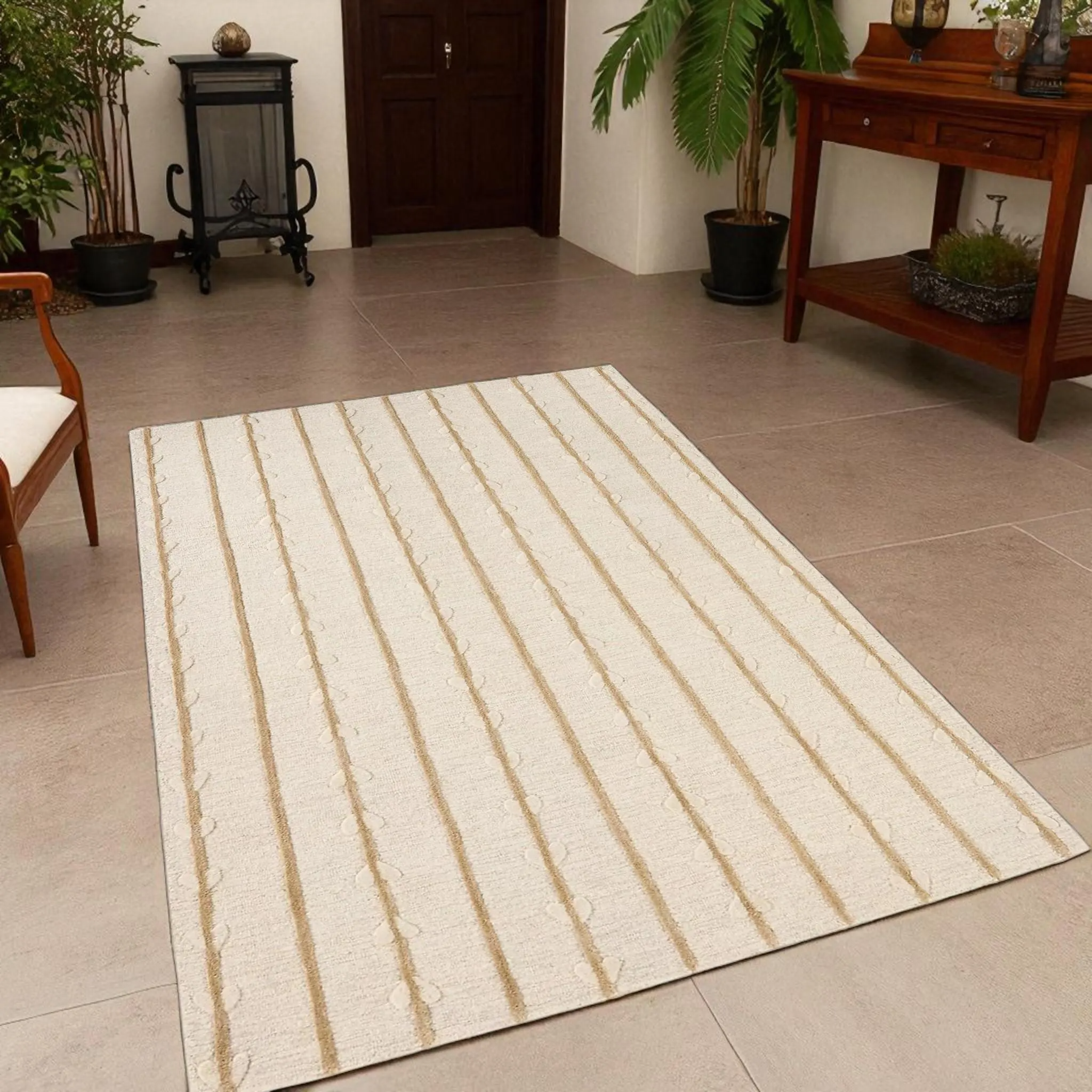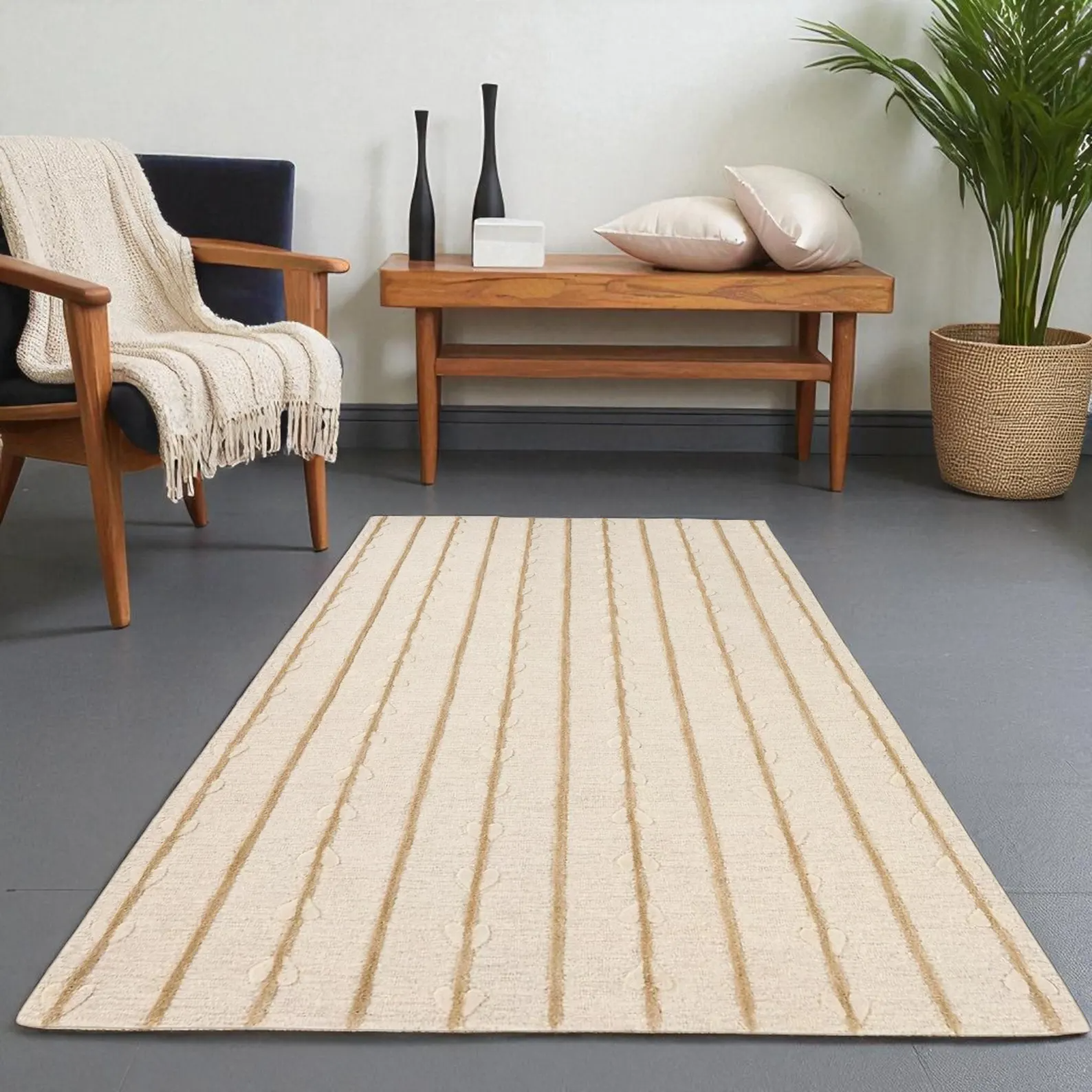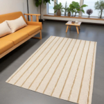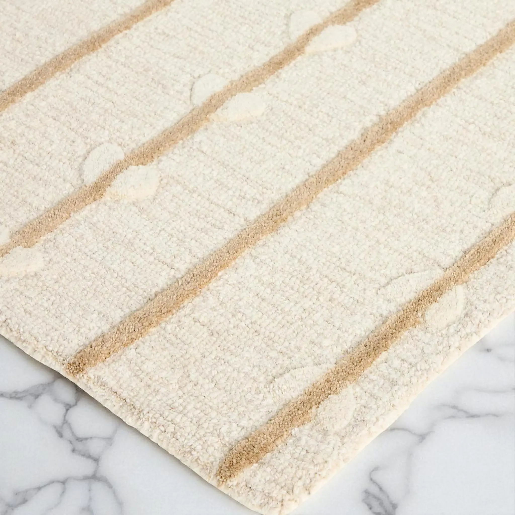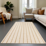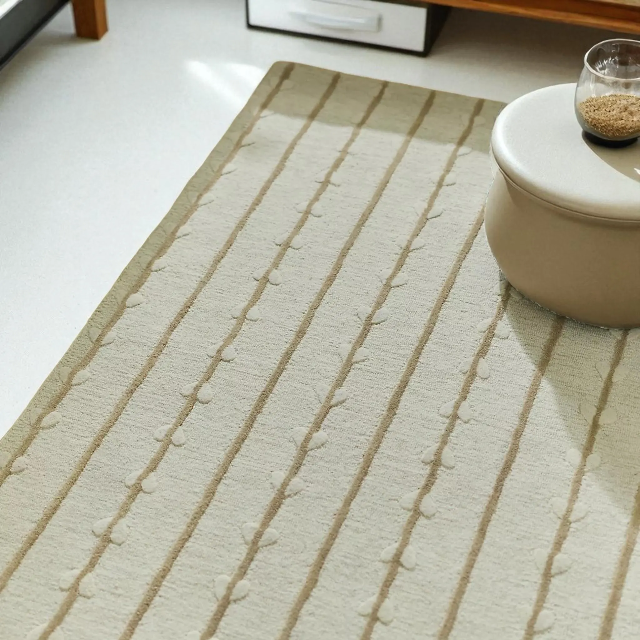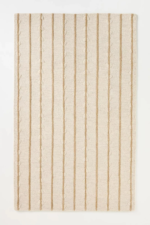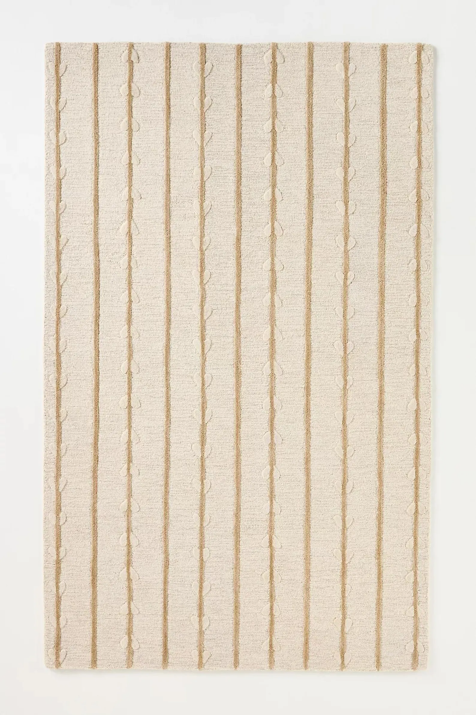Elevate your space with this exquisitely hand-tufted wool rug, designed with a serene, nature-inspired aesthetic. Soft vertical stripes flow gracefully alongside delicate vine and leaf motifs, creating a soothing balance between minimalism and organic beauty. The warm beige tones blend effortlessly with both modern and boho-inspired interiors, making it a versatile statement piece for your living room, bedroom, or favorite cozy nook.