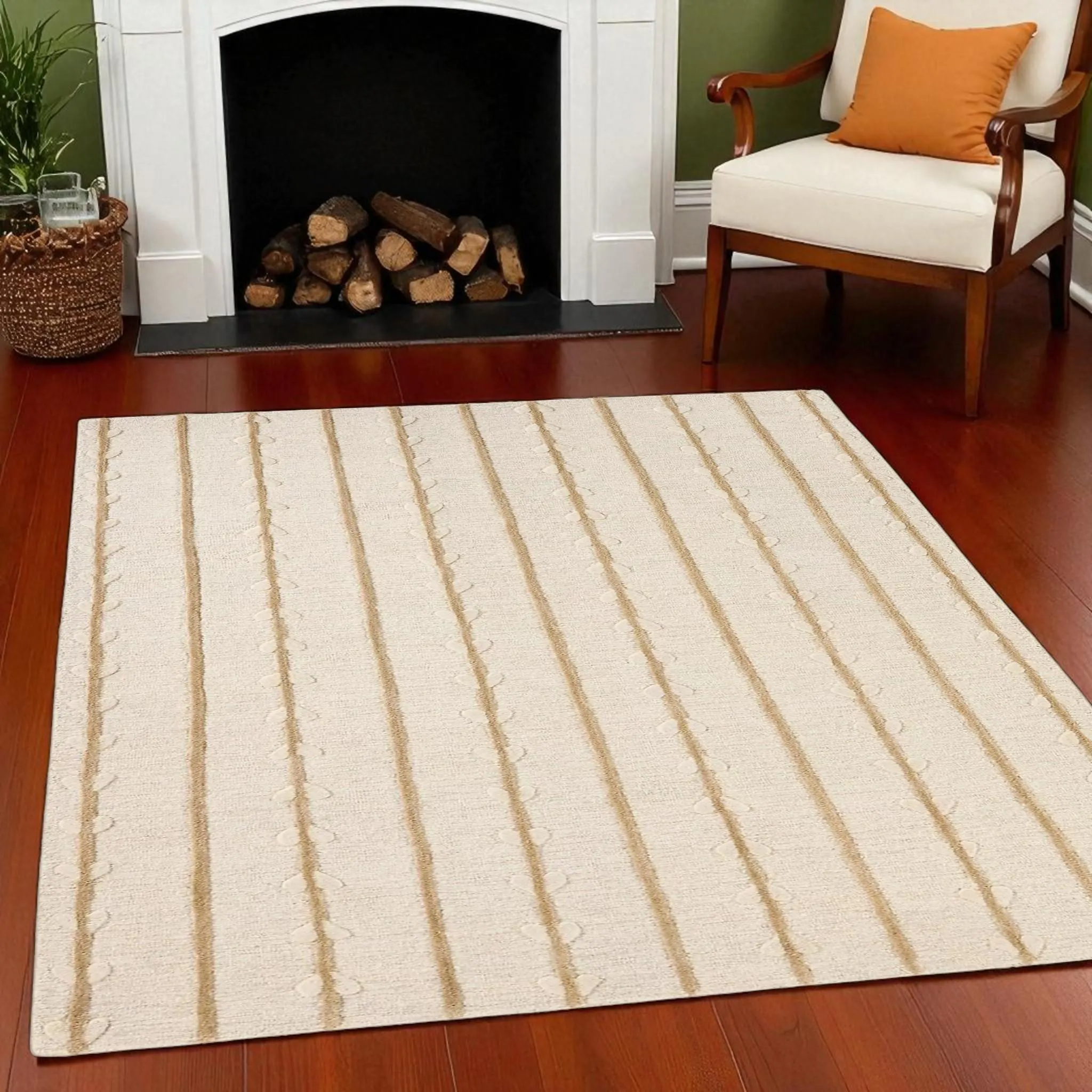 Hand Tufted Botanical Vine Inspired Vertical Striped Wool Rug, 8×10 Soft Beige Wool Area Rug, Modern Rug For Living Room Décor