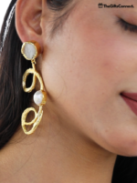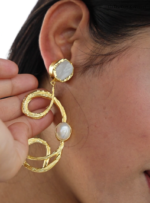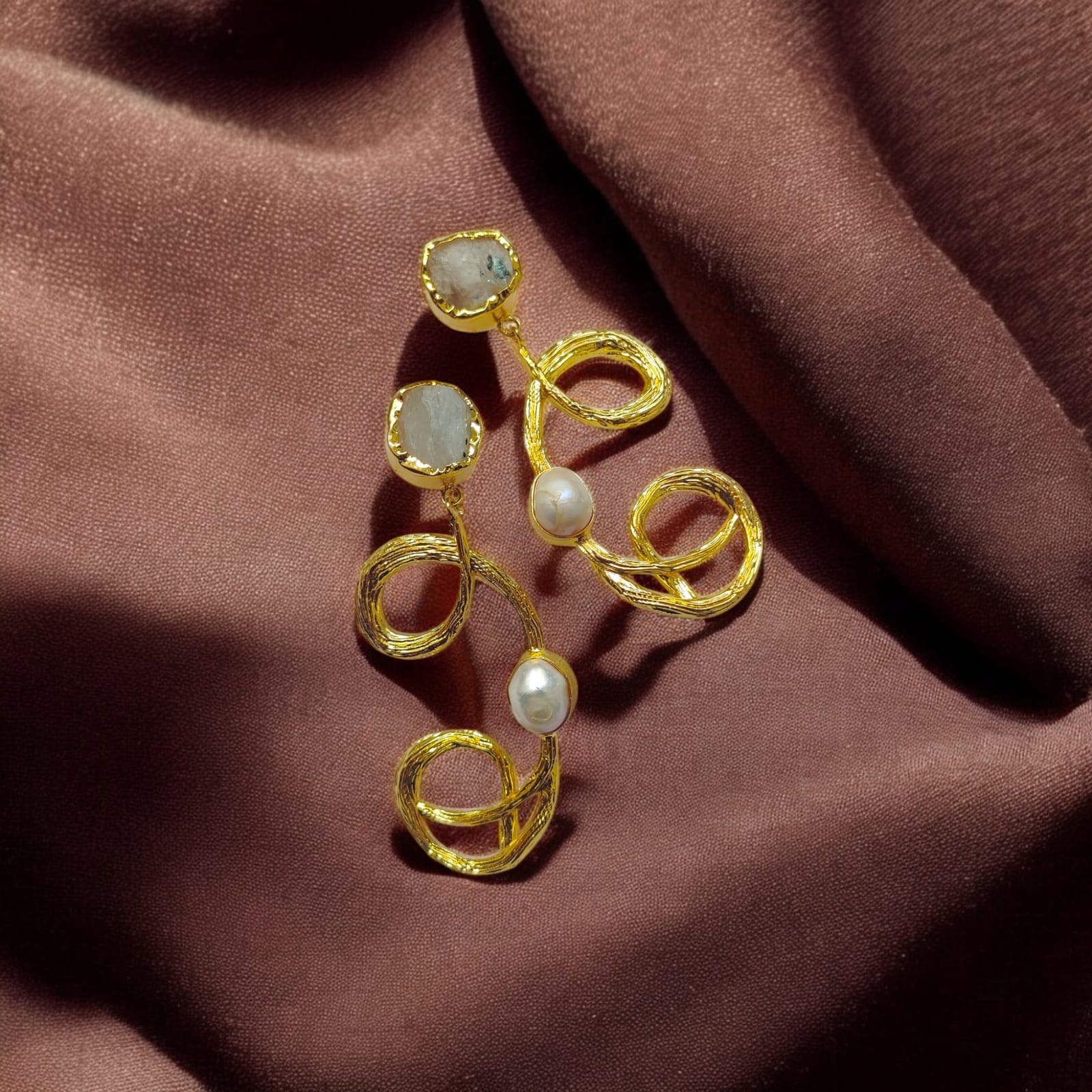 Each earring features a graceful spiral design, hand-forged from warm, golden-toned brass. Nestled within the spiral are a luminous freshwater pearl and a dreamy moonstone—gems known not only for their beauty but also for their soothing, feminine energy. The pearl adds a soft, classic glow, while the moonstone catches the light with ethereal flashes, almost like holding a piece of the moon itself.