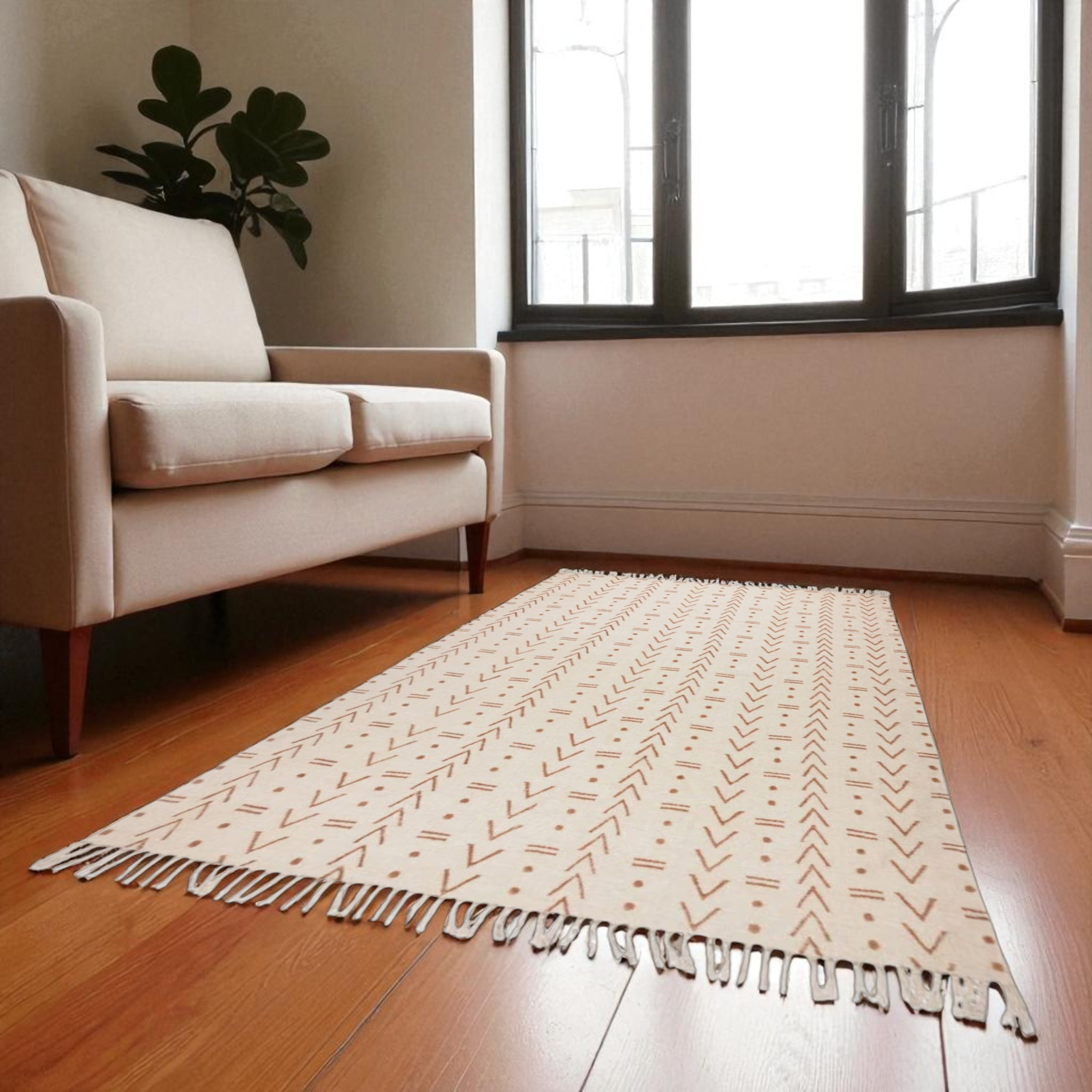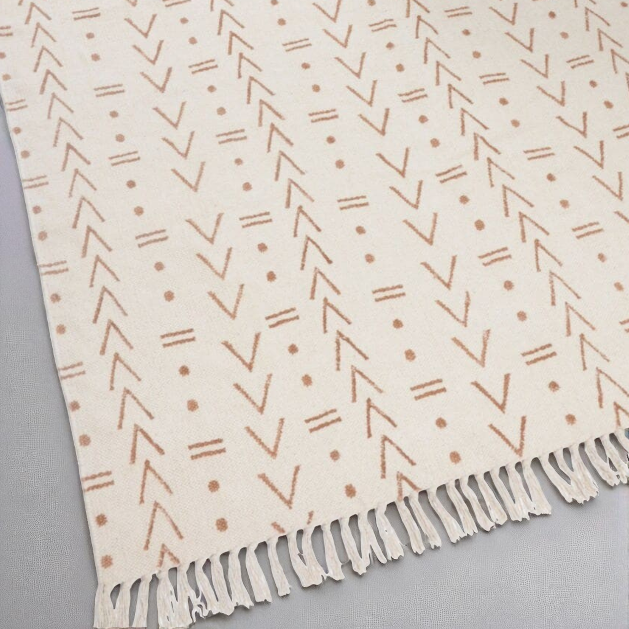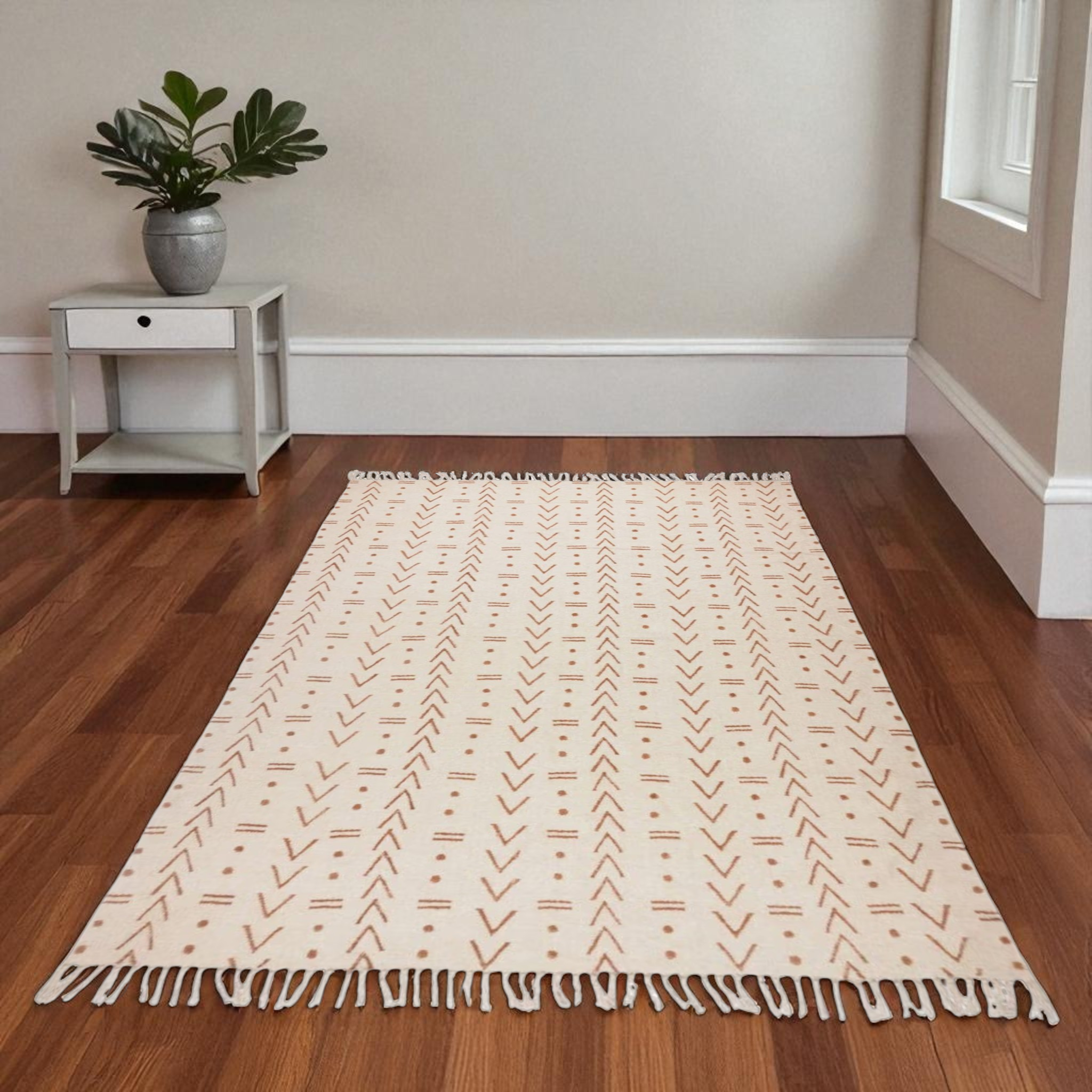 Elevate your space with timeless artistry and understated charm. Our Handwoven Chevron Pattern Tribal Cotton Rug is a beautiful fusion of minimalist elegance and traditional craftsmanship. Featuring a subtle tribal-inspired design with chevron and dotted motifs in a warm terracotta hue, this rug brings balance and texture to any room.
