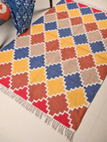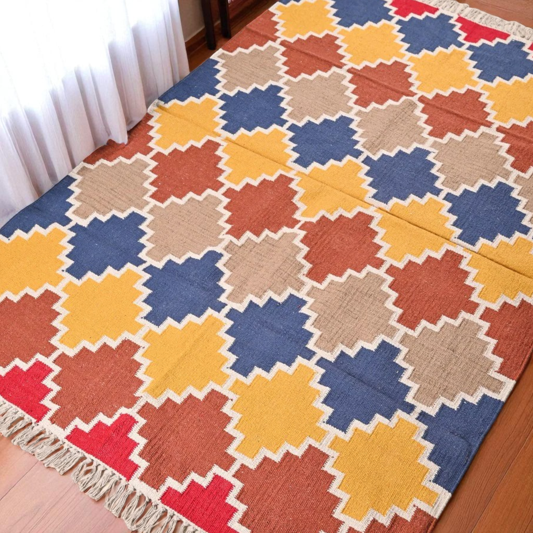 Add a burst of warmth, texture, and timeless style to your home with our Handwoven Multicolor Geometric Kilim Rug — a beautiful marriage of tradition and vibrant design. Thoughtfully woven by skilled artisans using ancient flatweave techniques, this cotton kilim tells a story through its bold diamond and chevron patterns, rendered in earthy hues of rust red, mustard yellow, navy blue, taupe, and ivory.