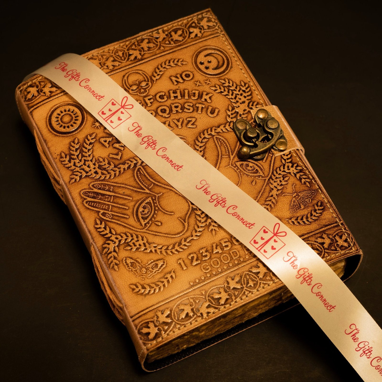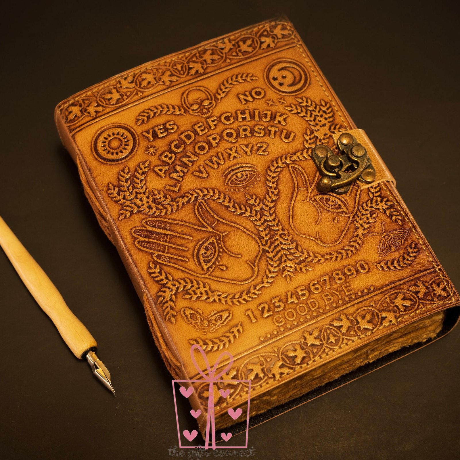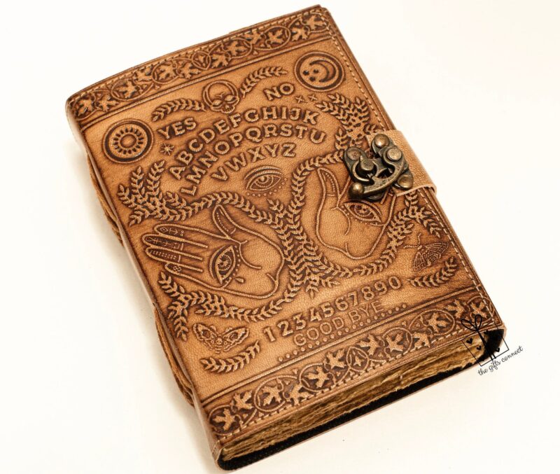 Step into the mystical world with this Ouija Grimoire Spirit Board Leather Journal, embossed with spiritual symbols and a planchette design. This antique-style handcrafted witch planner is more than just a journalโit’s a gateway to your innermost thoughts, dreams, and spiritual discoveries. Featuring a vintage brass C-lock, this medieval-inspired diary is perfect for witches, spiritual seekers, and lovers of the unknown.