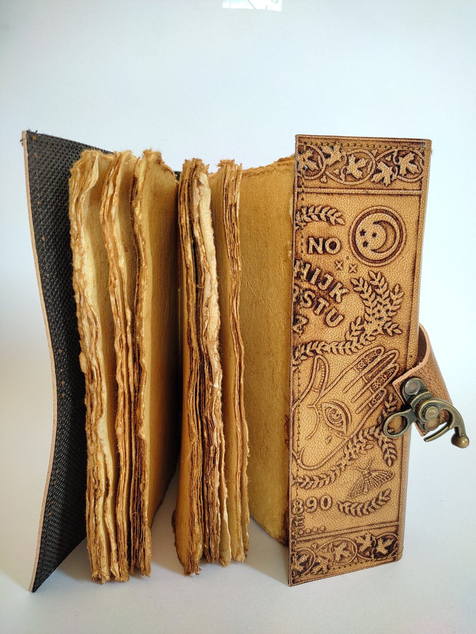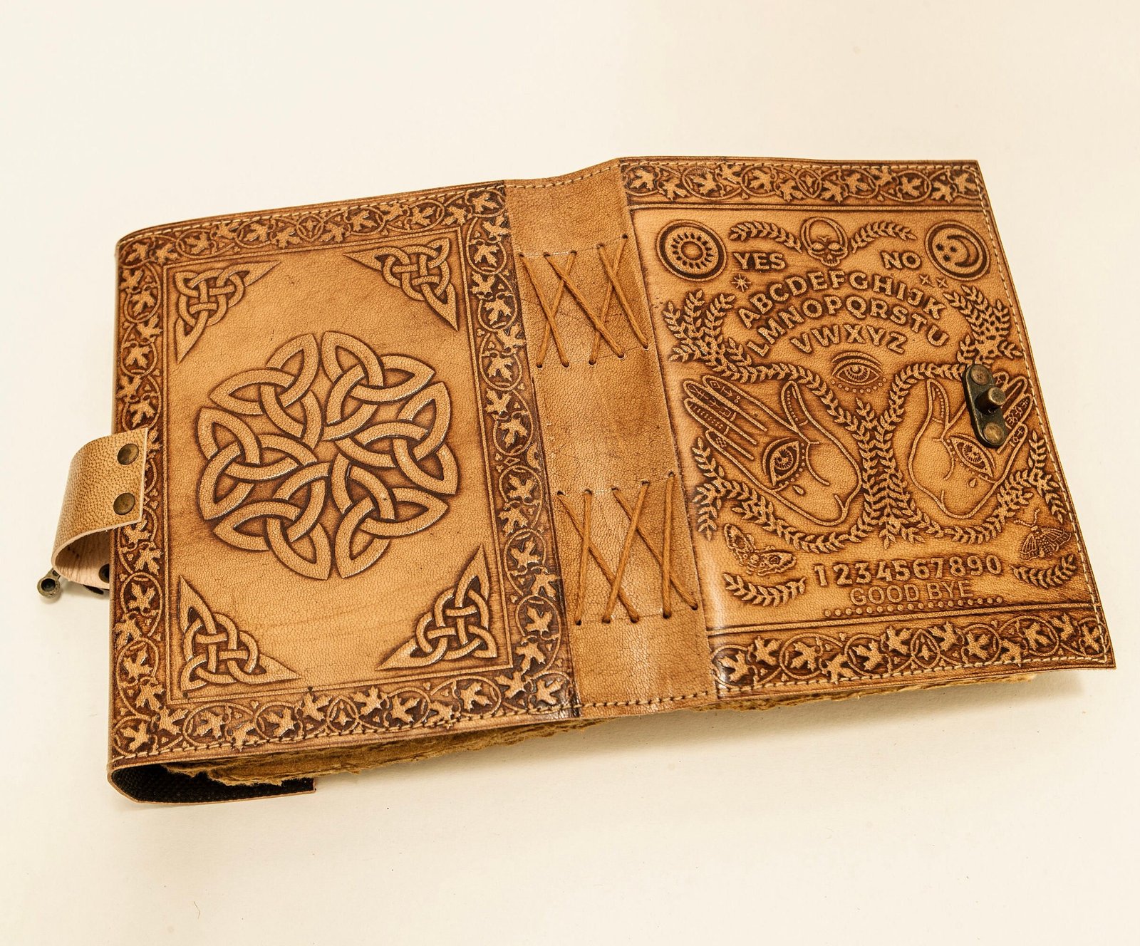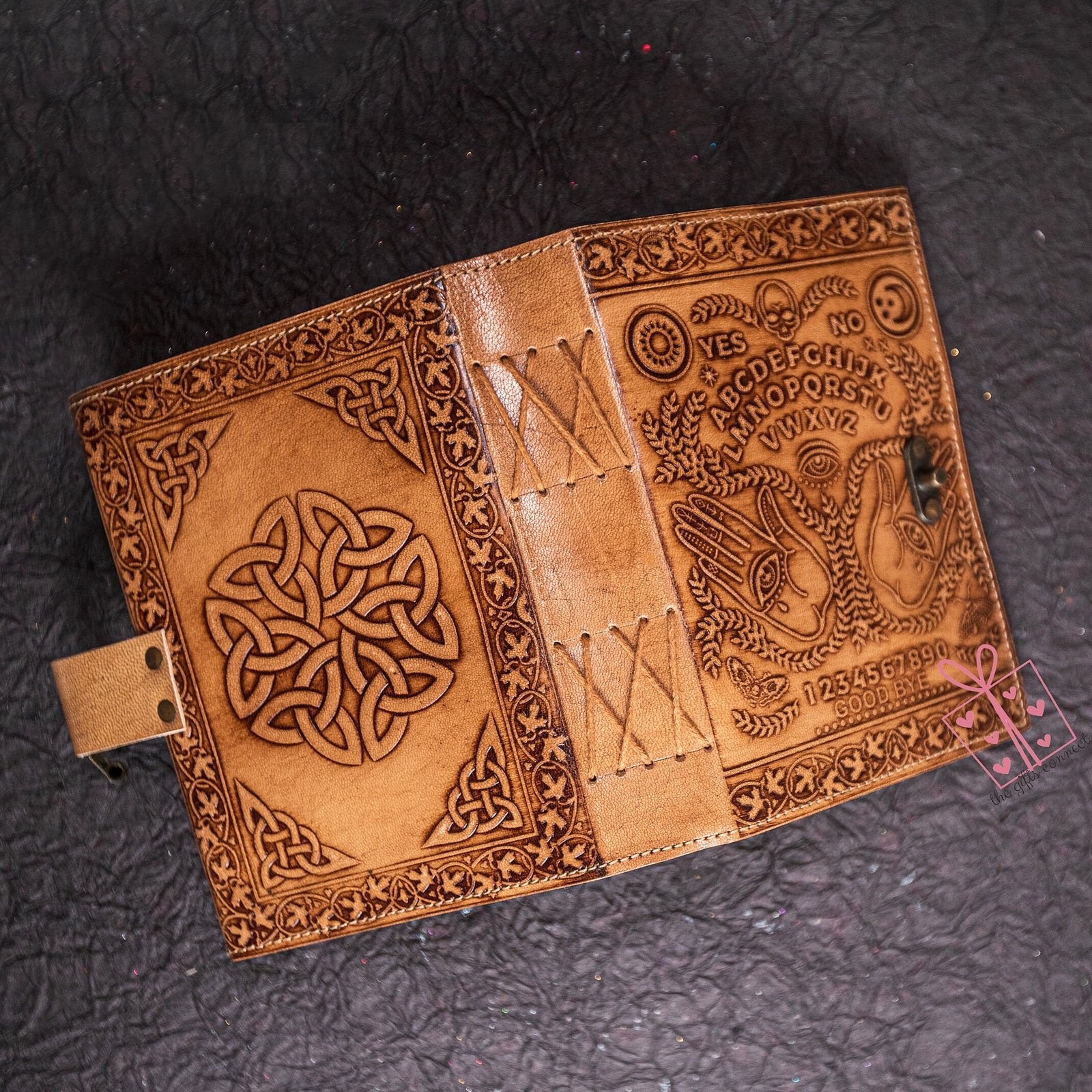 Step into the mystical world with this Ouija Grimoire Spirit Board Leather Journal, embossed with spiritual symbols and a planchette design. This antique-style handcrafted witch planner is more than just a journalโit’s a gateway to your innermost thoughts, dreams, and spiritual discoveries. Featuring a vintage brass C-lock, this medieval-inspired diary is perfect for witches, spiritual seekers, and lovers of the unknown.