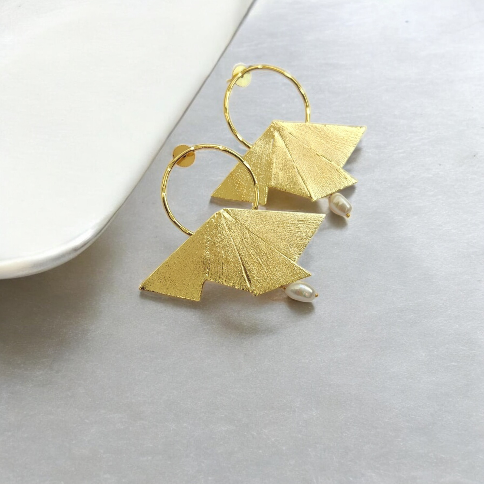 Handcrafted from golden-toned brass, these earrings play with clean lines and geometric forms, bringing a fresh and artistic edge to your accessory game. At the heart of the design lies a single, radiant pearl — a soft contrast to the structured brass shape — adding just the right amount of timeless charm to a thoroughly modern piece.