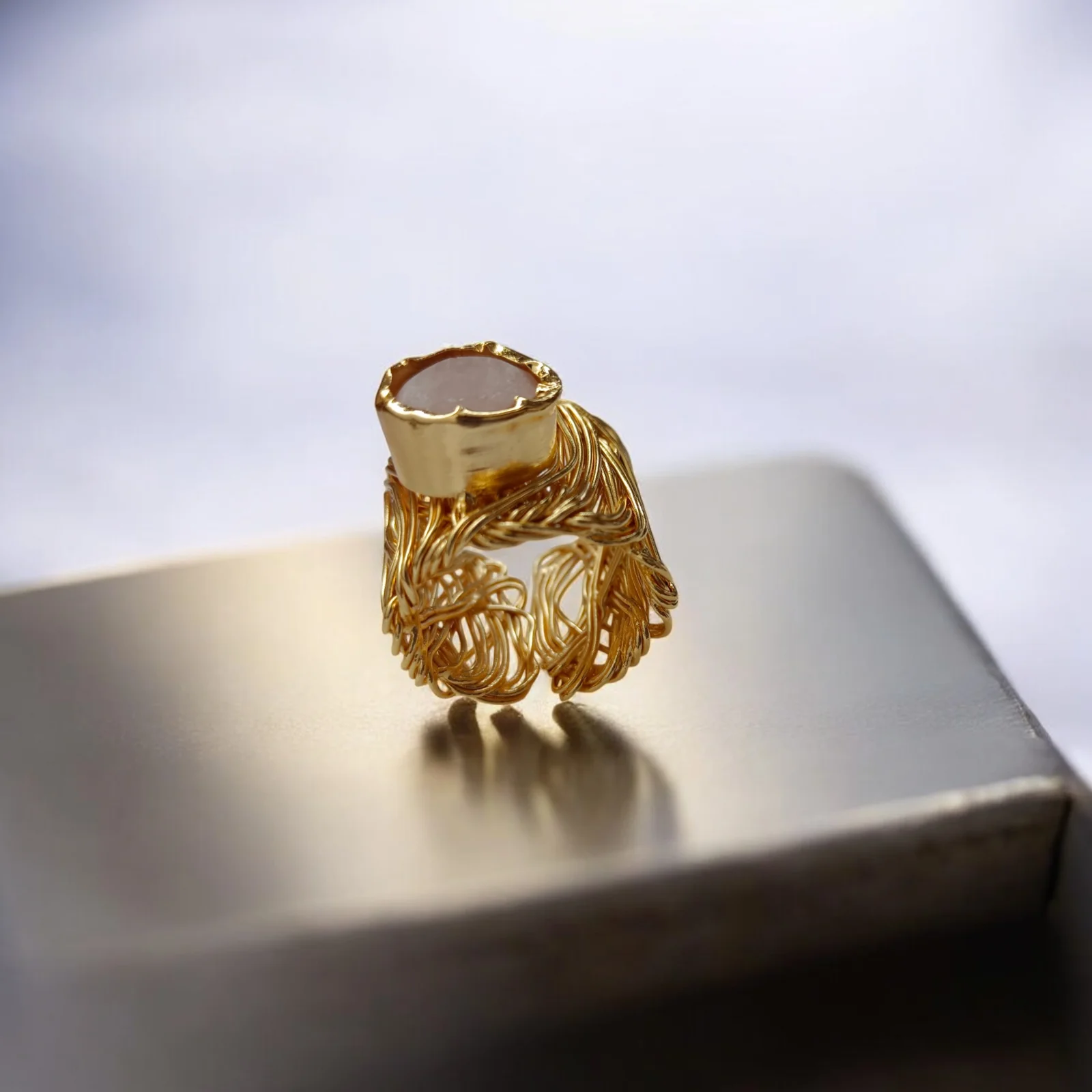 Each ring is meticulously crafted using fine brass wire, handwoven into an airy, lace-like setting that wraps around the gemstone like petals holding morning dew. At its heart, the rose quartz glows with a soft blush—gentle, calming, and quietly radiant. Wearing Petal Cage feels like holding a love letter from the earth: a reminder of gentleness, compassion, and inner light. Whether you see it as a symbol of healing, romance, or simple beauty, this ring adds a layer of emotion to your everyday adornment.