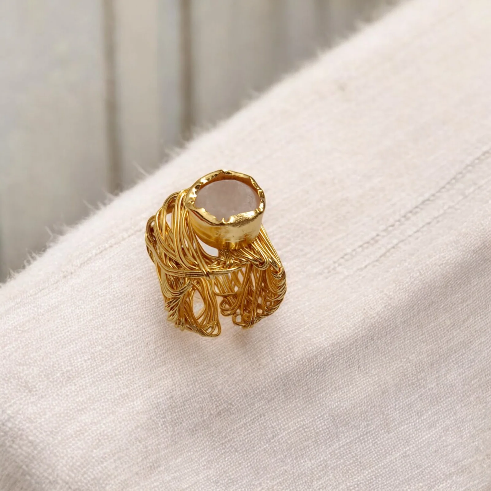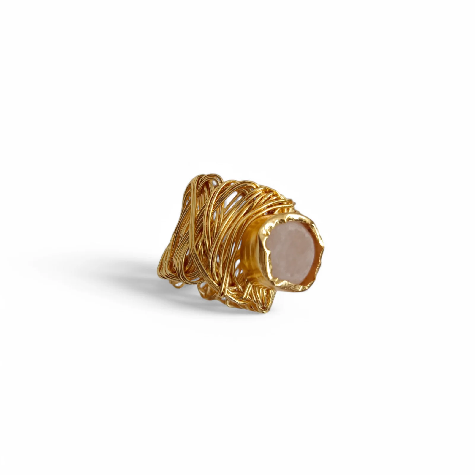 Petal Cage: Brass Crochet Ring with Blush Quartz