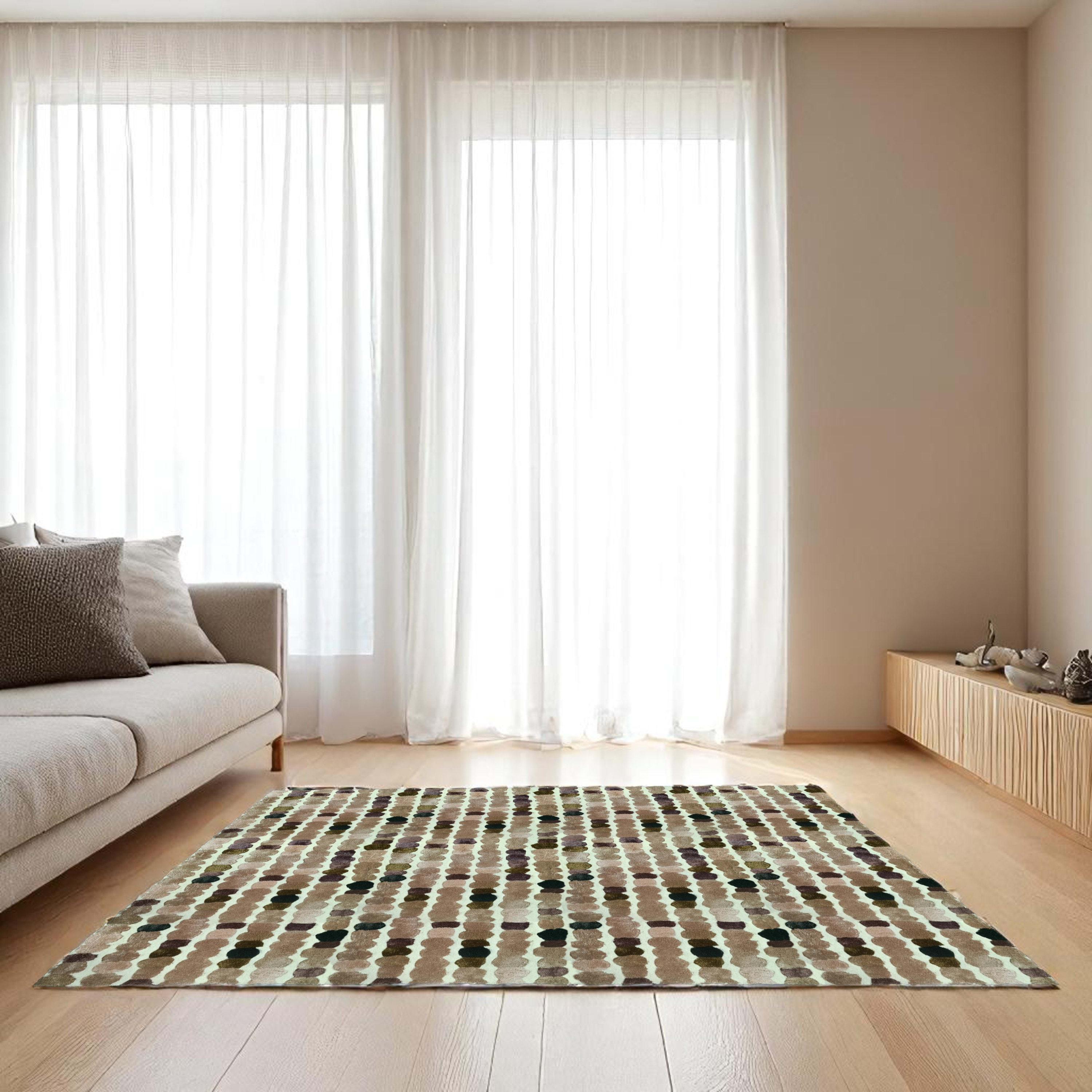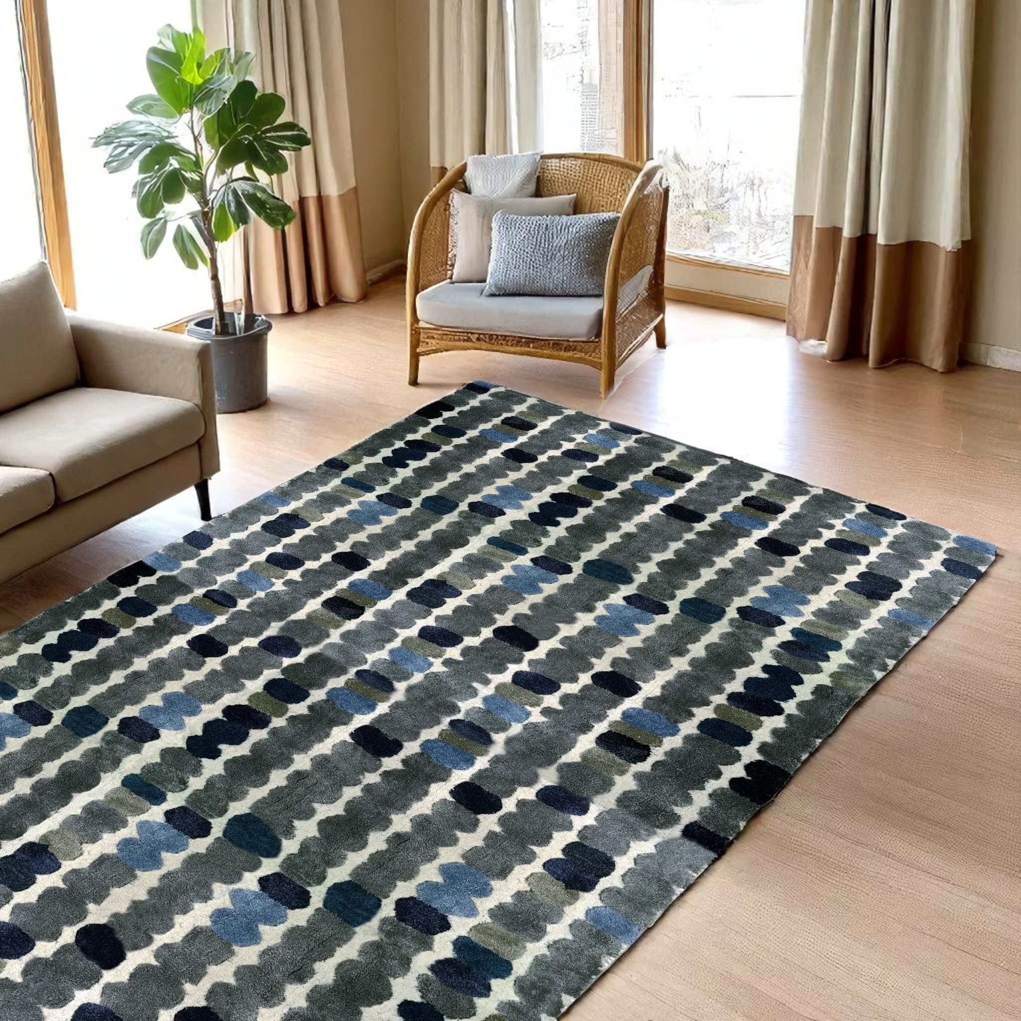 Bring cheerful sophistication into your home with this modern polka dot rug — a playful yet elegant piece that effortlessly balances comfort and design. Hand-tufted by skilled artisans in India, this rug is made from a plush blend of natural wool and viscose, giving it a soft, luxurious feel underfoot and a subtle sheen that elevates its style.