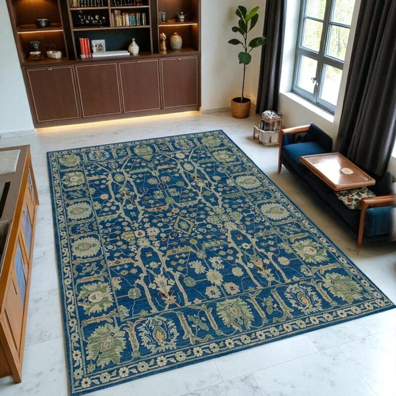Royal Blue Handwoven Traditional Floral Wool Rug, Oriental Style Area Rug 8×10, Persian Inspired Carpet, Living Room & Bedroom Wool Rug