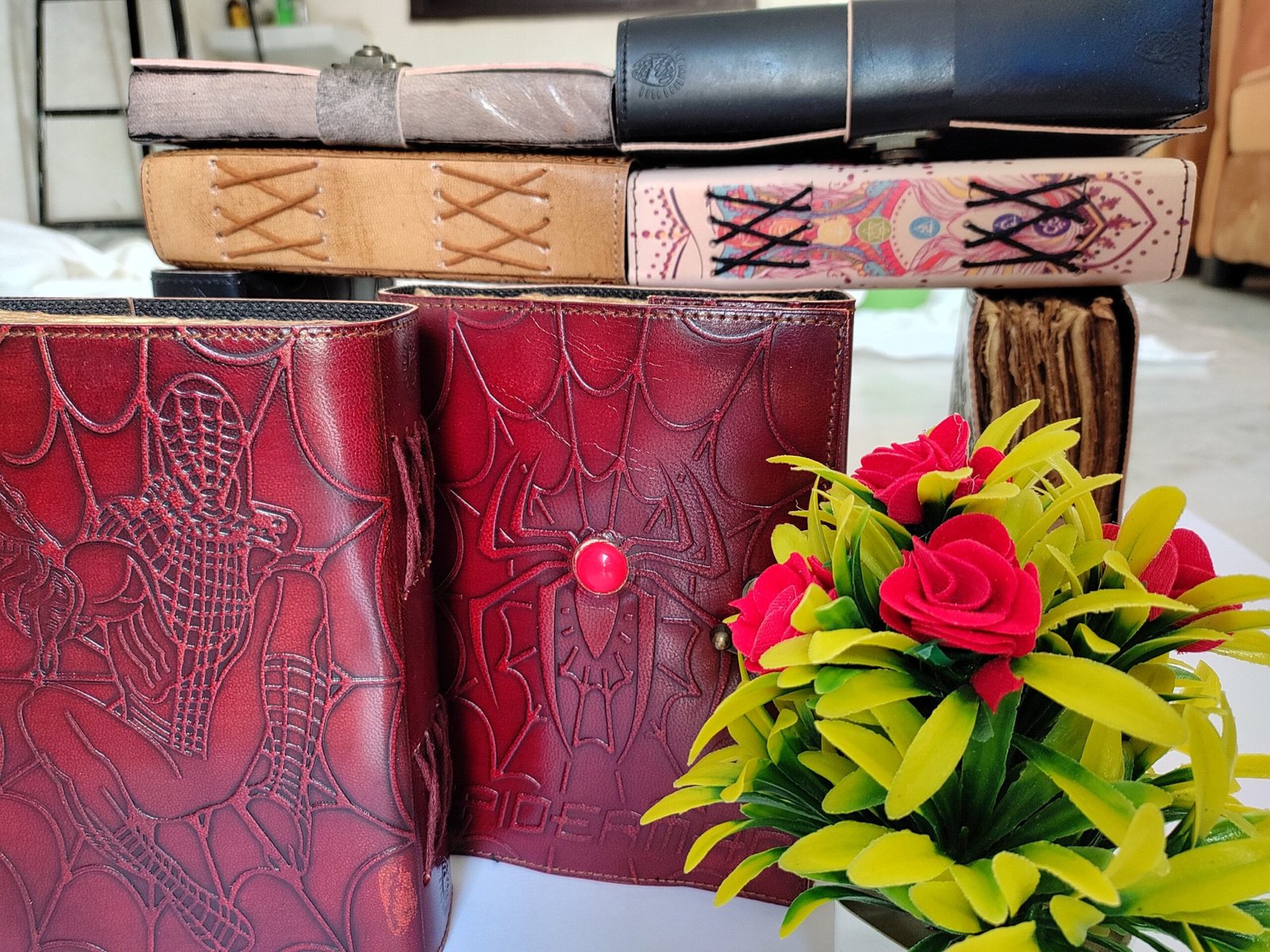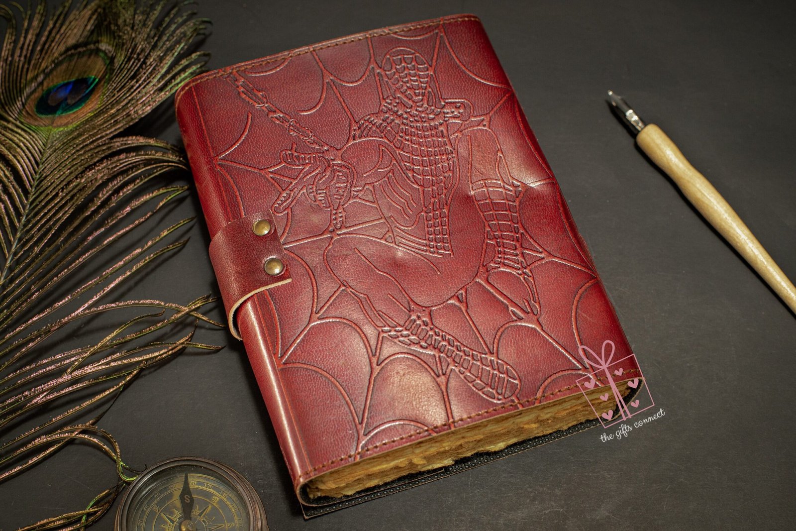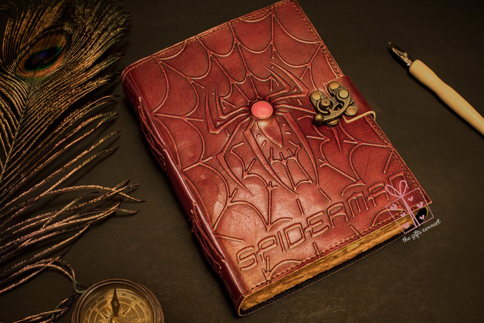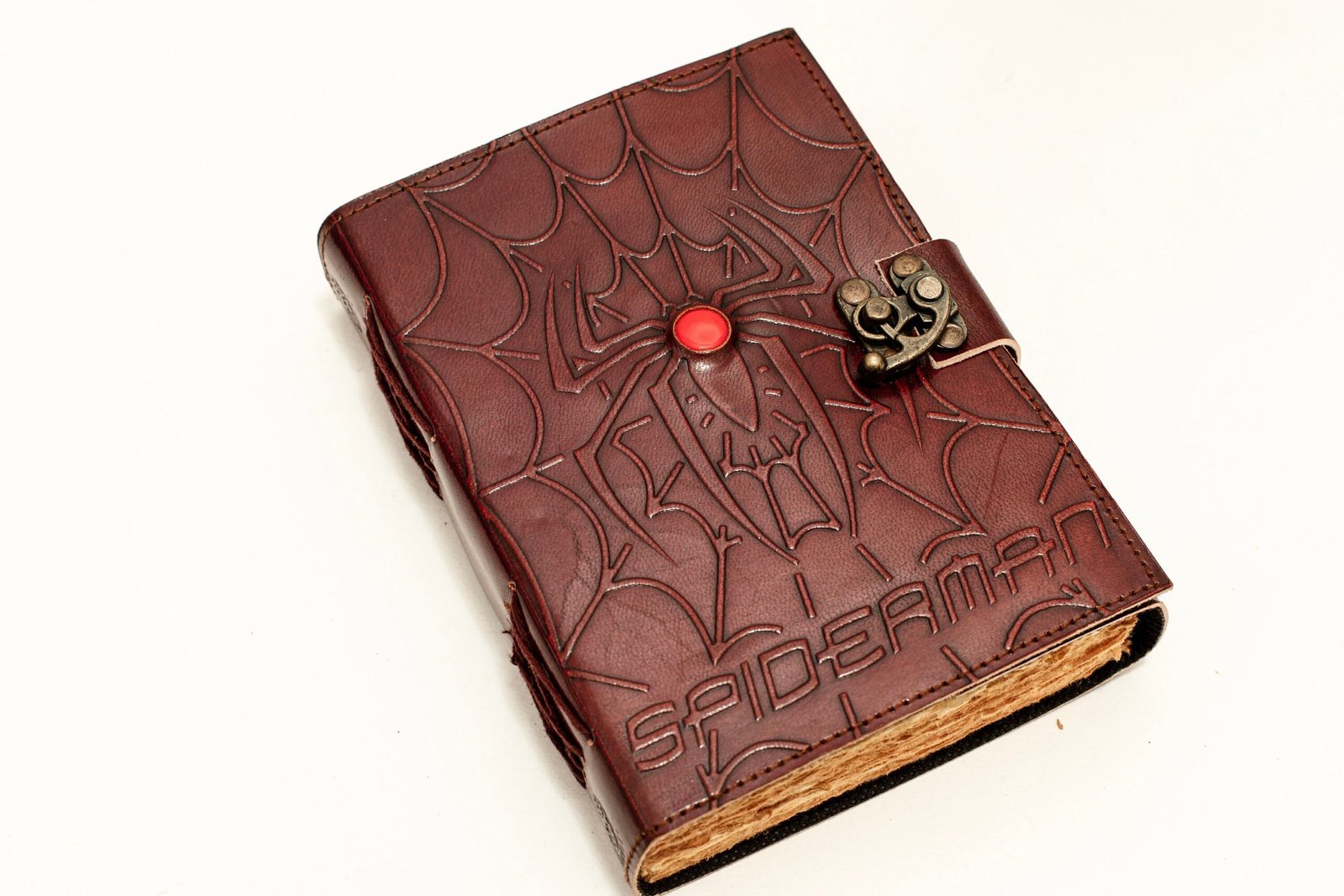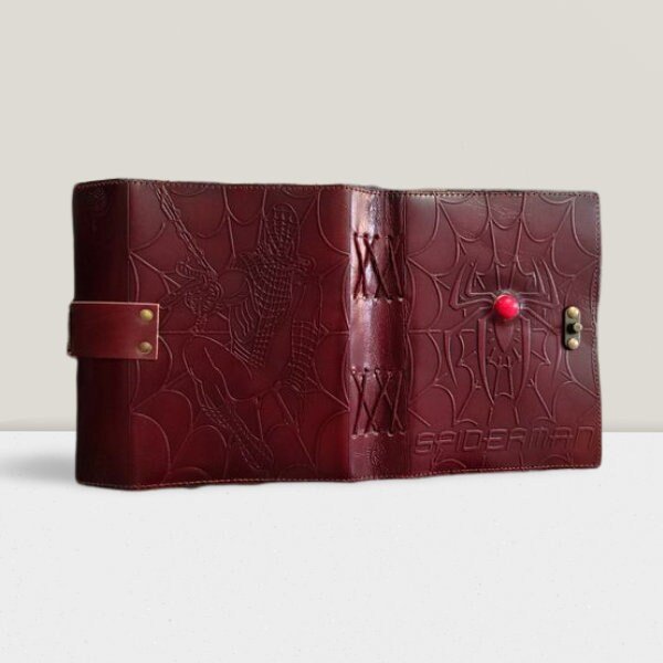 Unleash your inner superhero with this Spiderman-inspired leather journal! Embossed with an intricate Spider-Man design, this handcrafted notebook is the perfect travel companion for Marvel lovers, artists, writers, and dreamers. Featuring a semi-precious stone at the center, this one-of-a-kind keepsake is designed to fuel your creativity and passion for adventure.